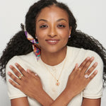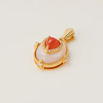 Ez a bonyolult és gazdagon díszített medál olyan, mintha egy koronaékszert hordanánk nyakunkban. A vörös achát, fehér gyöngyház és csillogó kristályok kombinációja arannyal bevont ezüst foglalatban egy királyi örökségre emlékeztet, amelyet egy nagy ünnepségen viselhetnek, vagy generációkon keresztül örökíthetnek tovább. ( Az ár csak a medálra vonatkozik, a nyakláncot nem tartalmazza. )