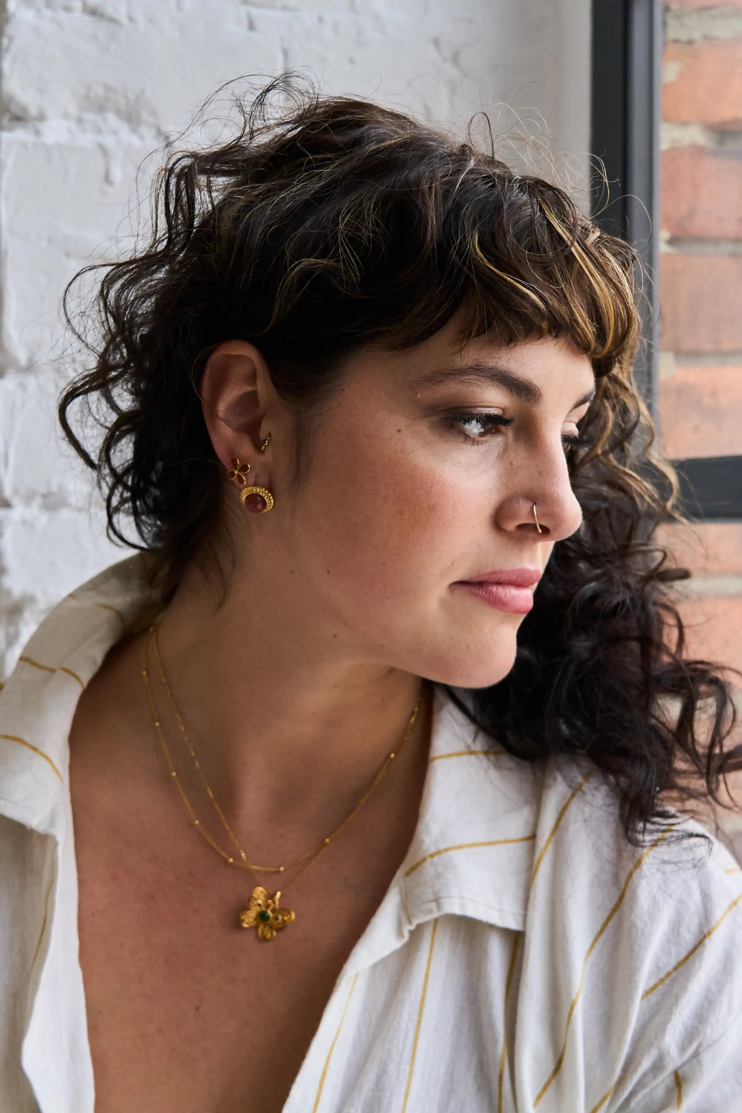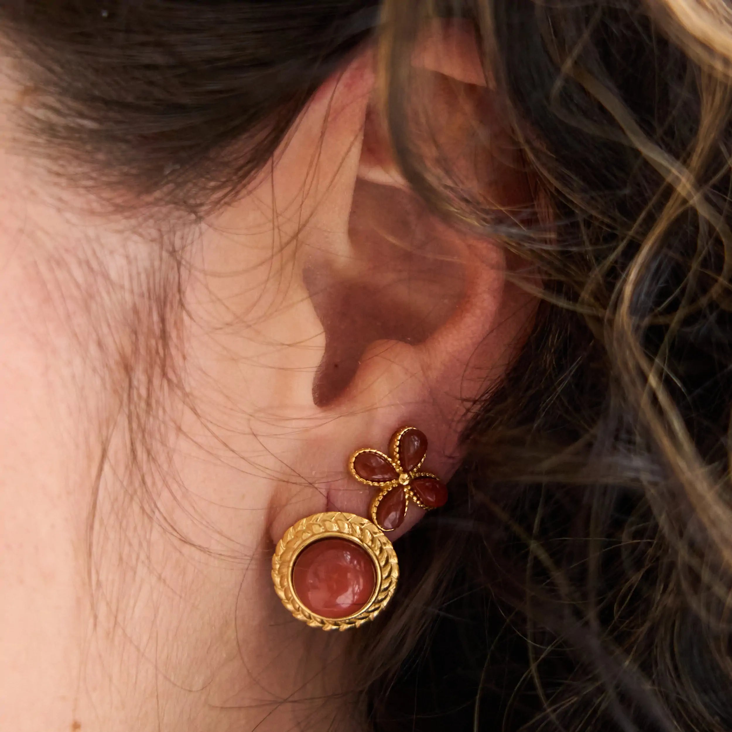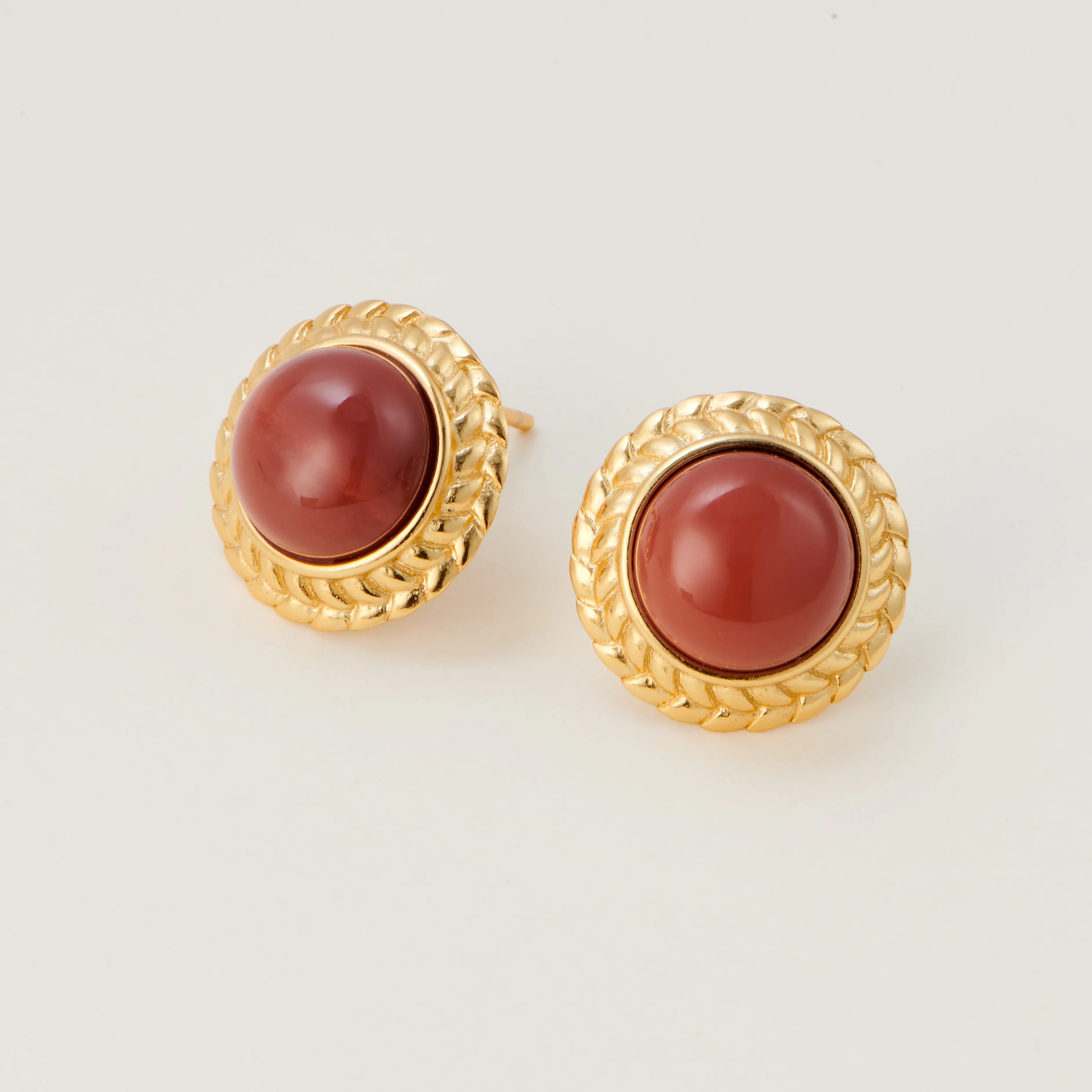 The red agate fits perfectly into the woven patterned socket, evoking the radiant rising sun.