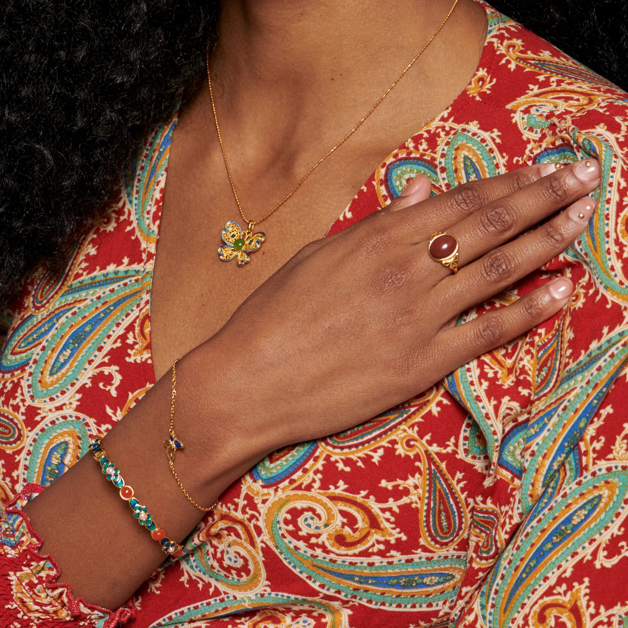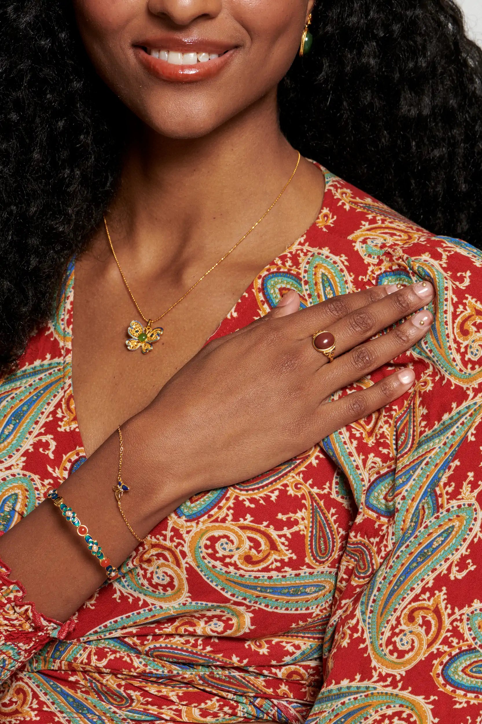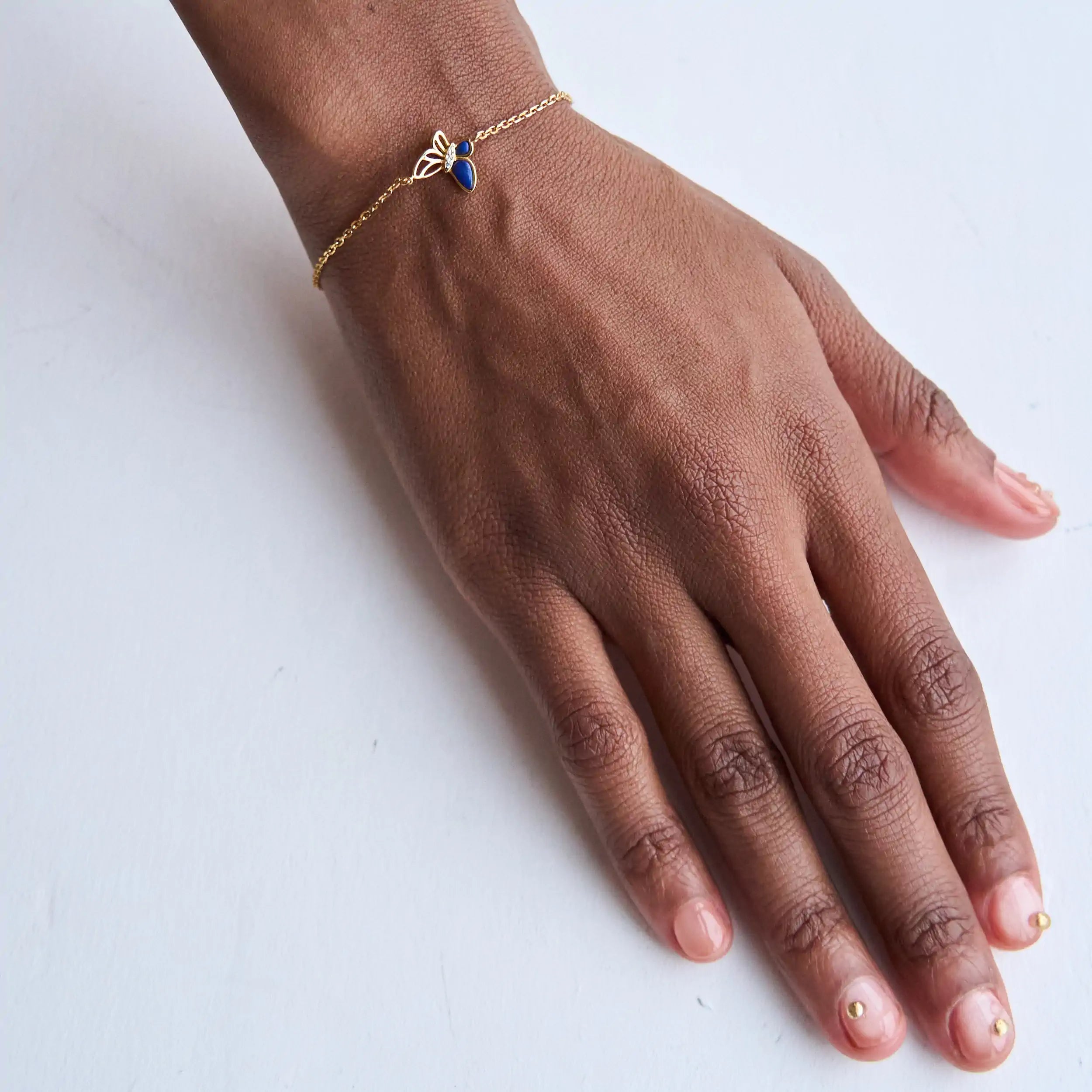 A charming little butterfly on a gold-plated chain, which also represents transformation, as while one of its wings consists of contoured, openwork lines, the butterfly's deep blue color appears on the other wing, shaped by lapis lazuli stones.