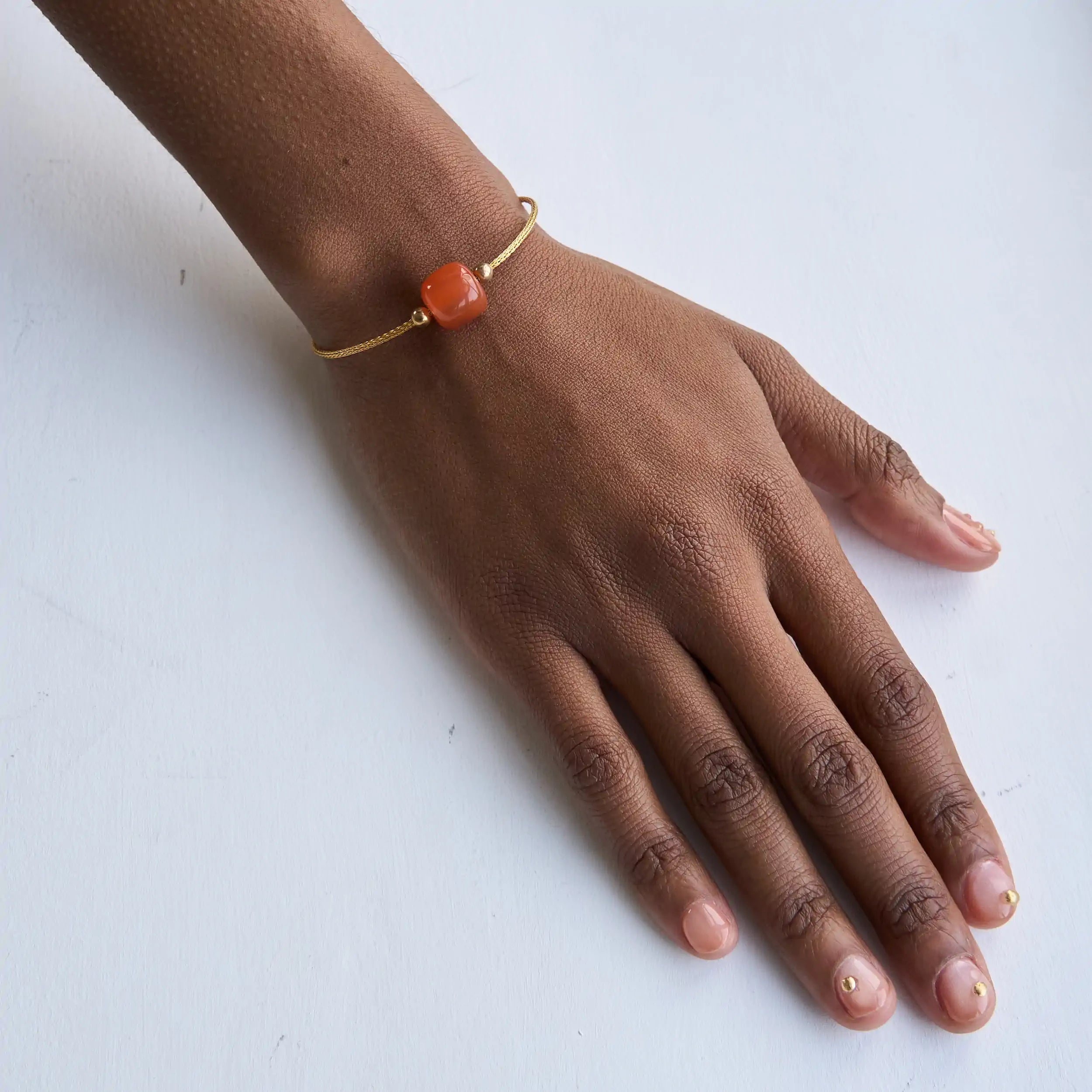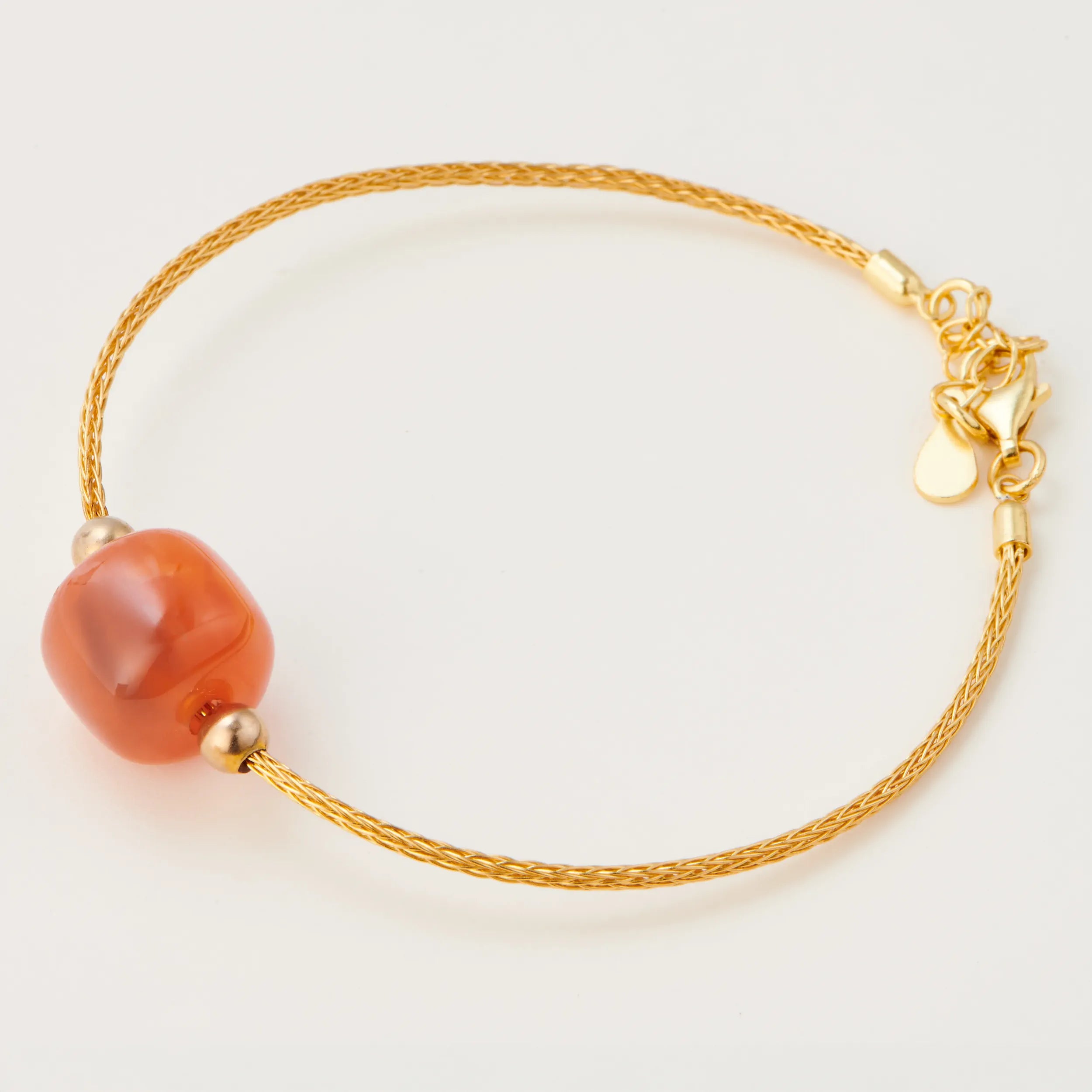 In addition to the style of the bracelet, the main agate is also unique, the translucent stone with its glowing red color gives it a fiery look. The chain has a distinctive, braided design, and its thickness matches well with the large and attention-grabbing stone.