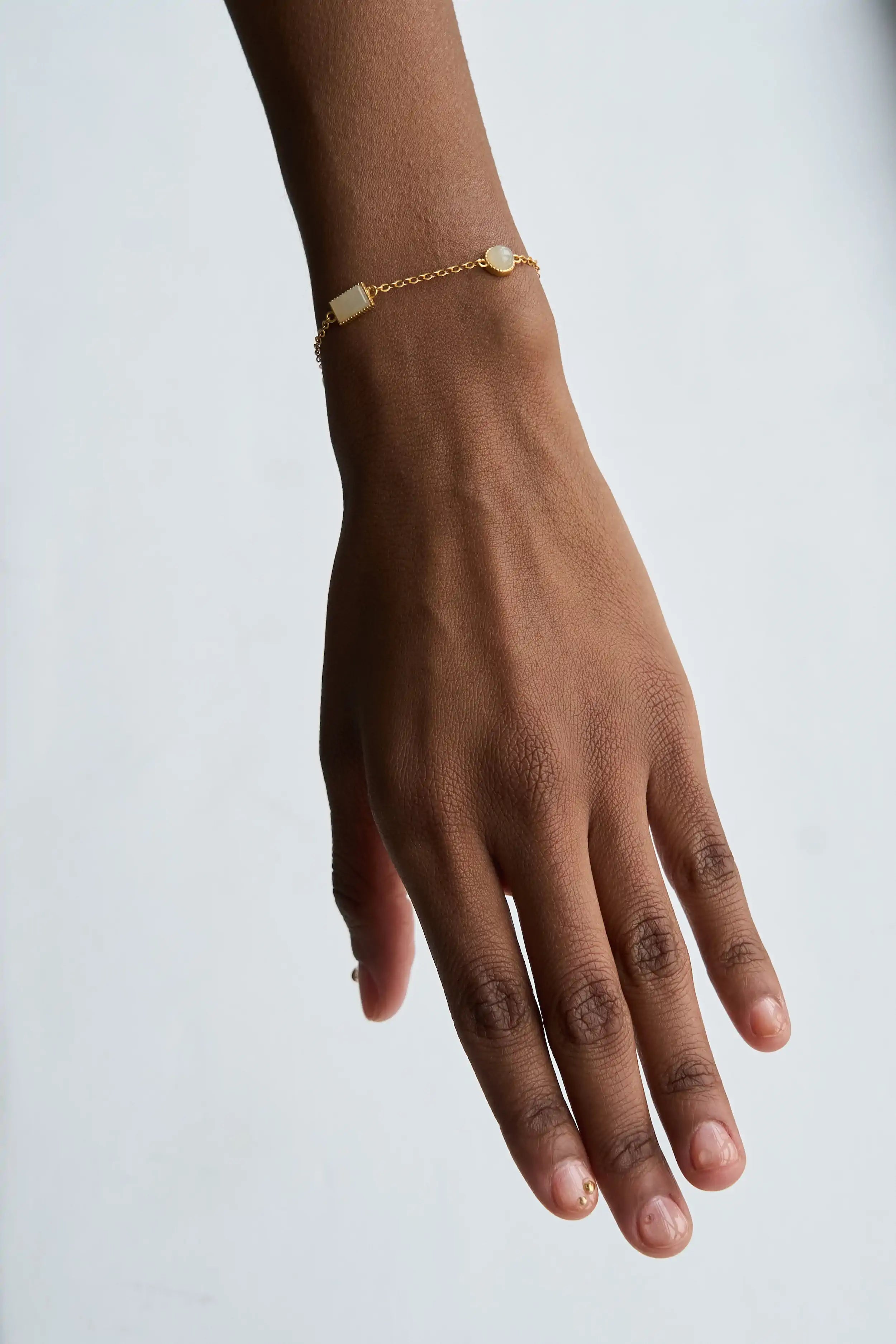 Geometric is a modern bracelet with white jade stones cut into various geometric shapes, the lines of which are precisely followed by gold-plated silver settings. This bracelet is adorned with a clean simplicity and the style of "less is more".