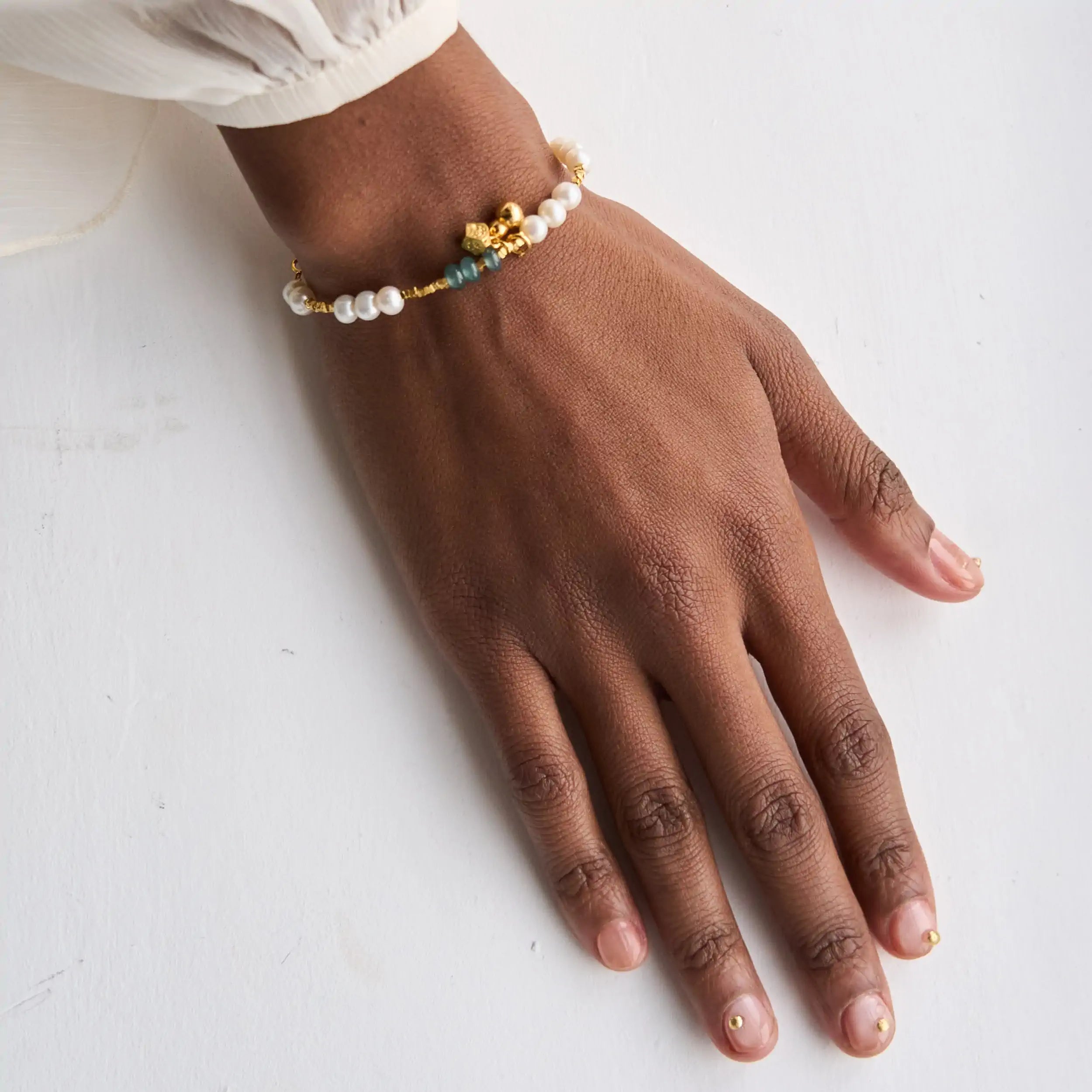 The bracelet, rich in translucent blue jade and pearls, on a shimmering gold-plated chain, gives the feeling of a bright, sunny beach. The jade stones and pearls are connected by small, differently shaped links that resemble many small beach pebbles.