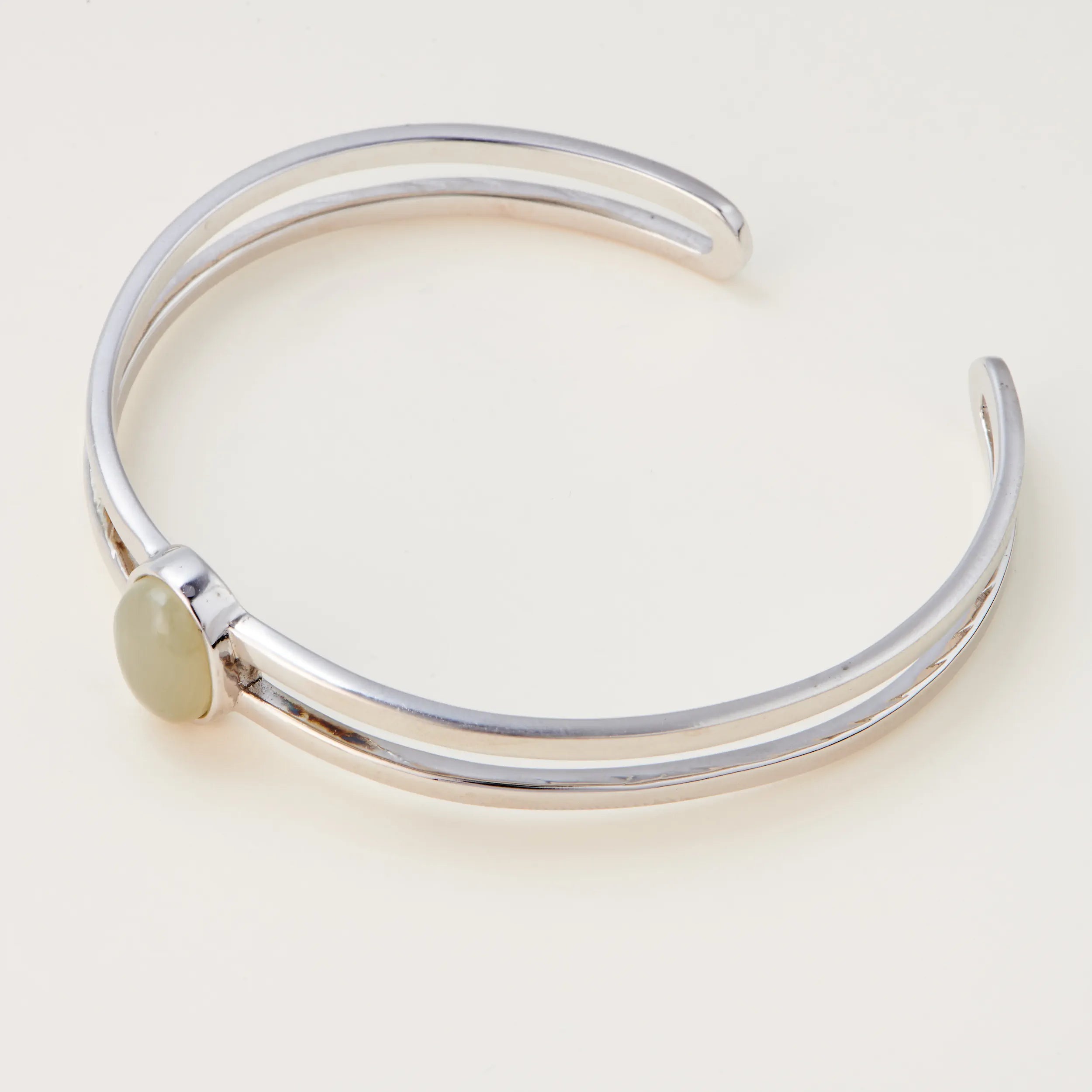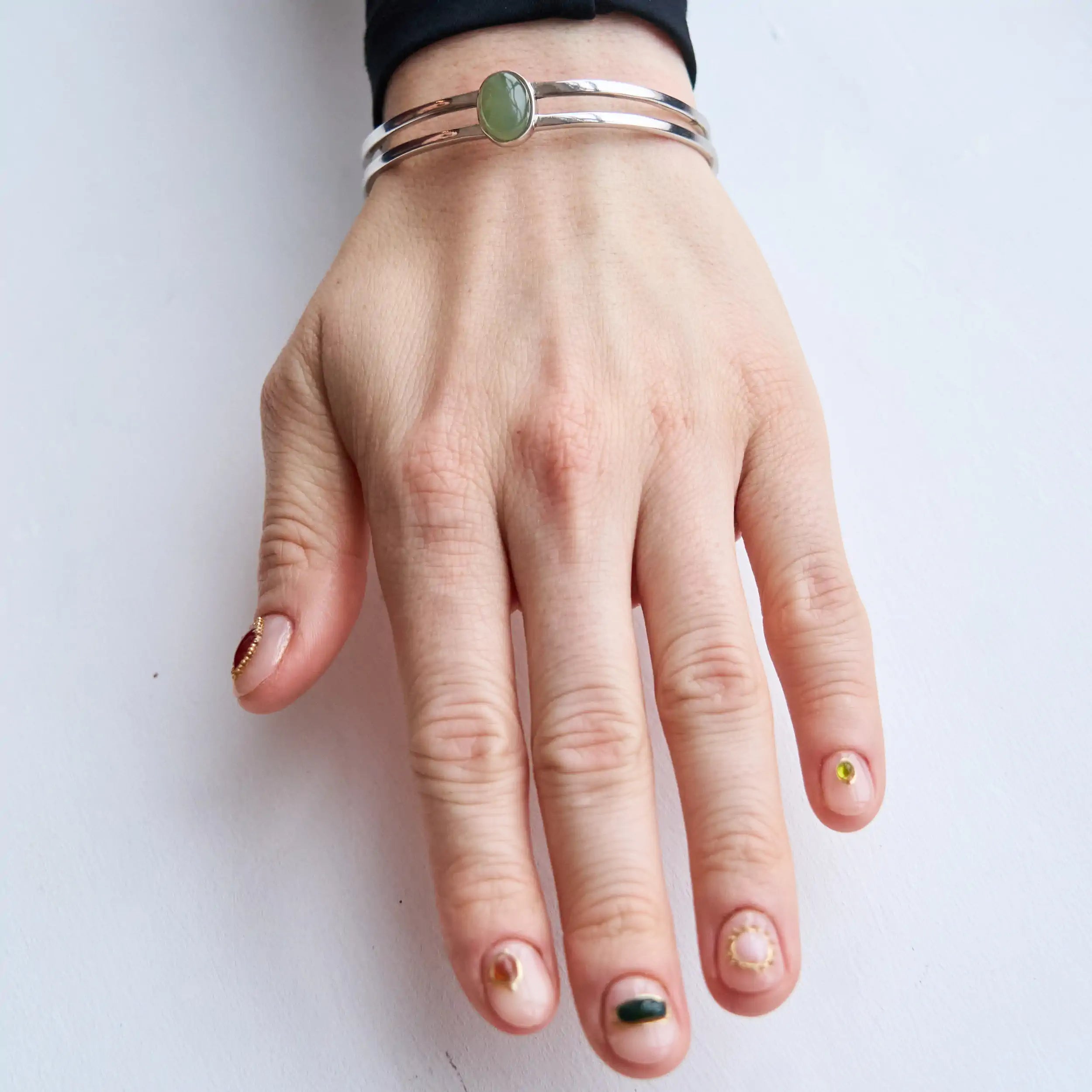 This silver bracelet evokes modern minimalist design. Two parallel silver bands hug the wrist, with a smooth, round jade stone in the center. The bright shine of the silver and the calm green hue of the jade embody a harmonious fusion of nature and modern art.