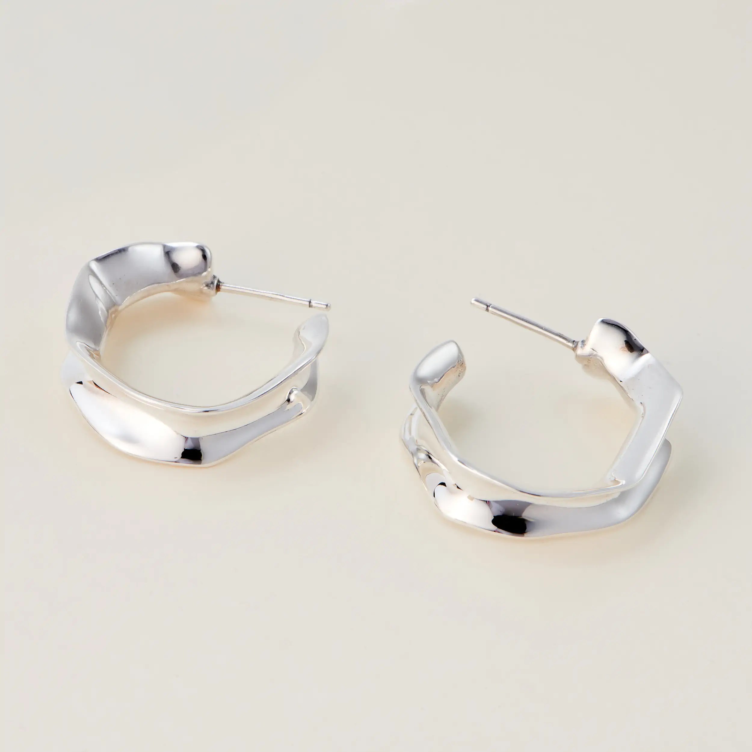 Amorph is an absolutely modern looking pair of earrings, every side, facet and curve of which is created by randomness and spontaneity. The mirror-polished surfaces of the sterling silver reflect differently from every angle, displaying spontaneity in this as well.