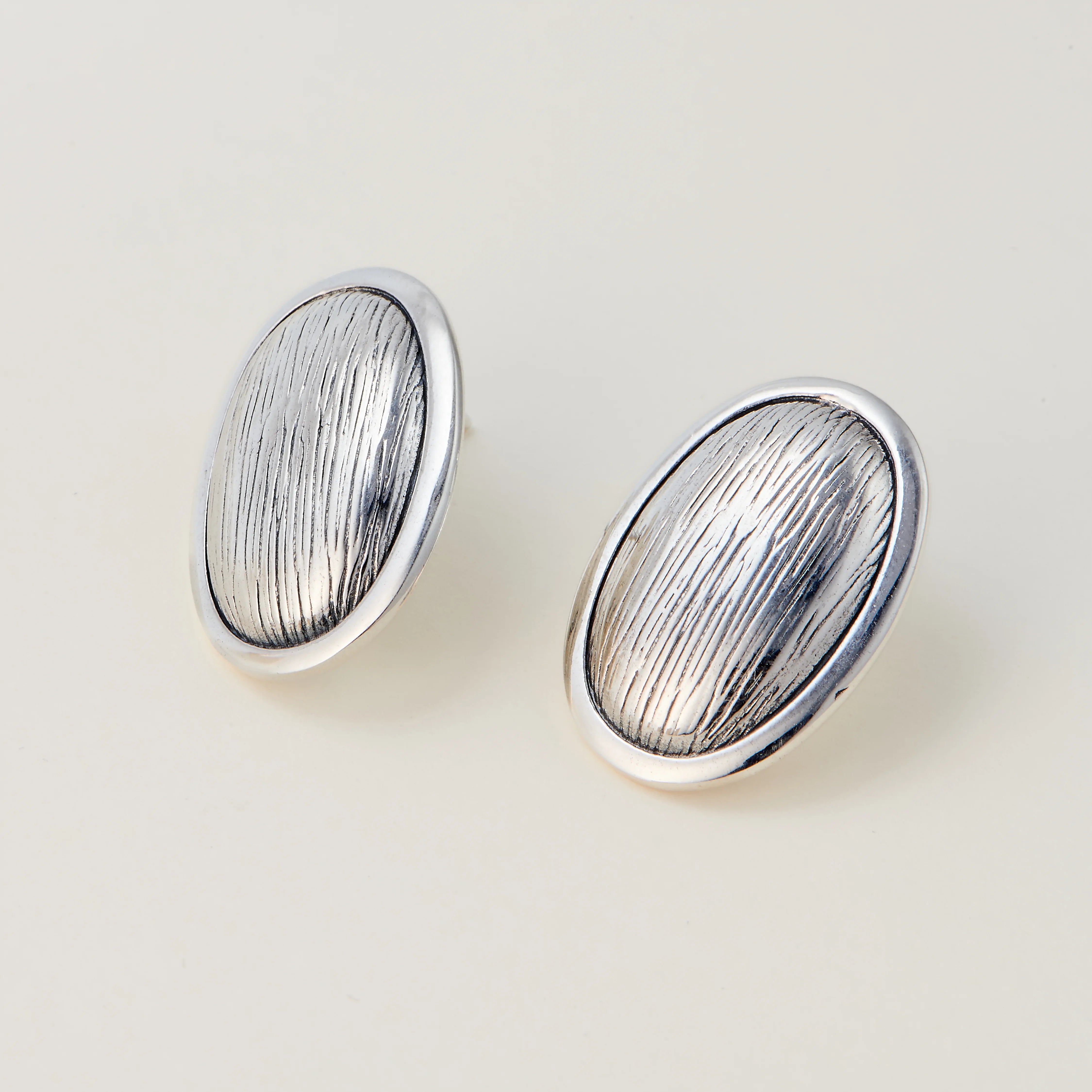 The Wooden Mirror earrings are made of sterling silver, which evokes the texture of wood, combined with the shine of a mirror. The organic shapes and smooth surface create a special harmony.