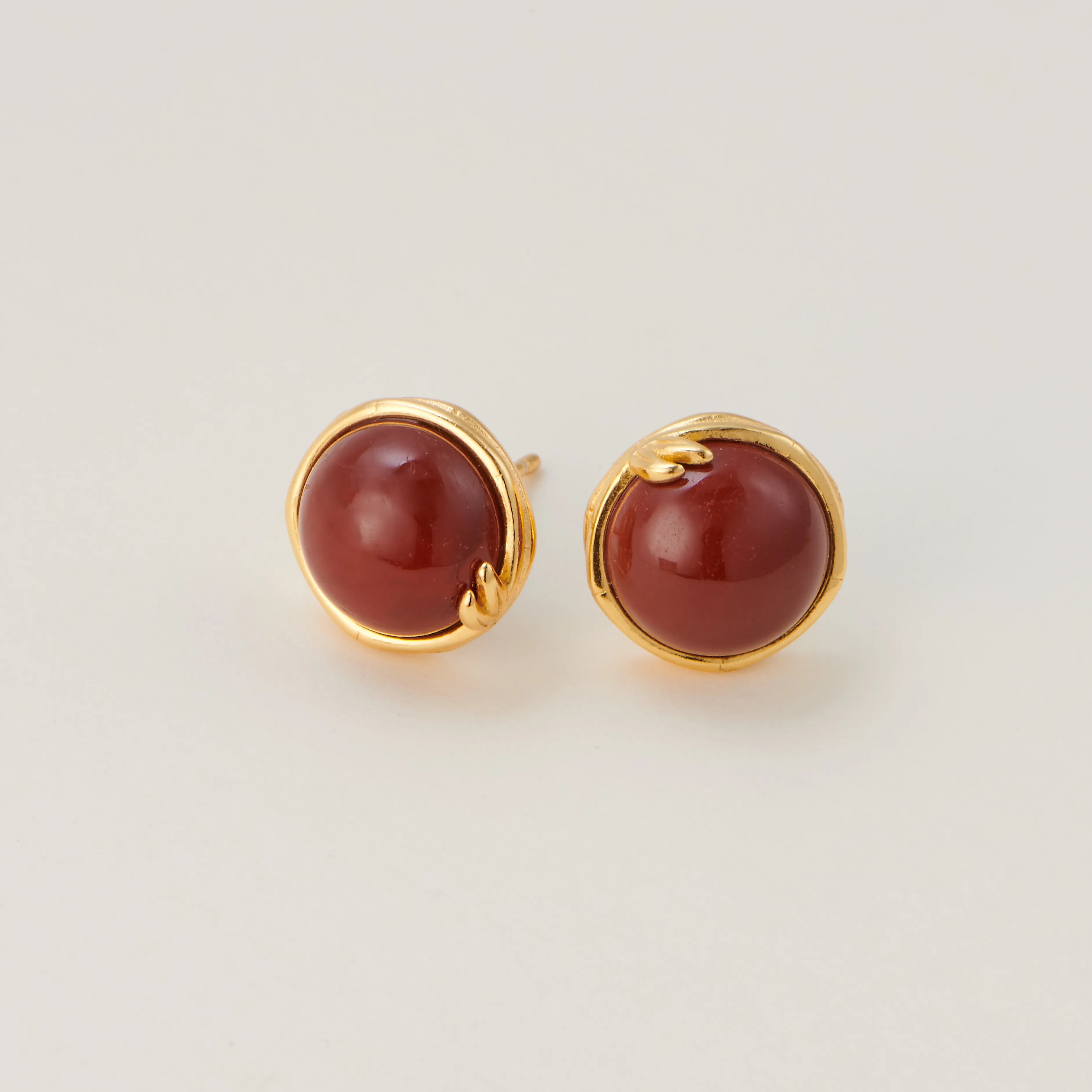 These gold-plated silver earrings adorned with velvety red agate stones evoke the golden sun's corona surrounding a red-hued twilight.