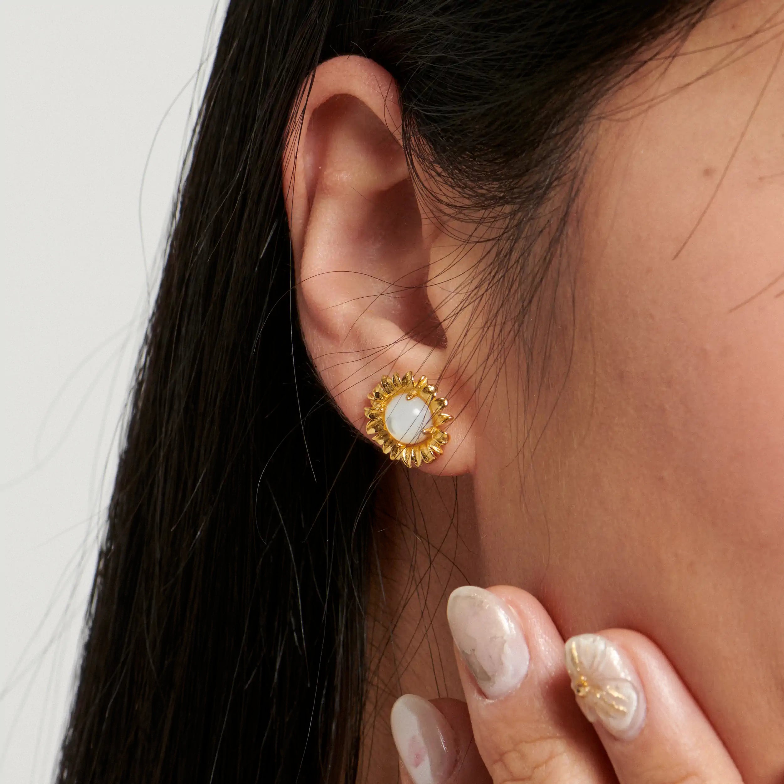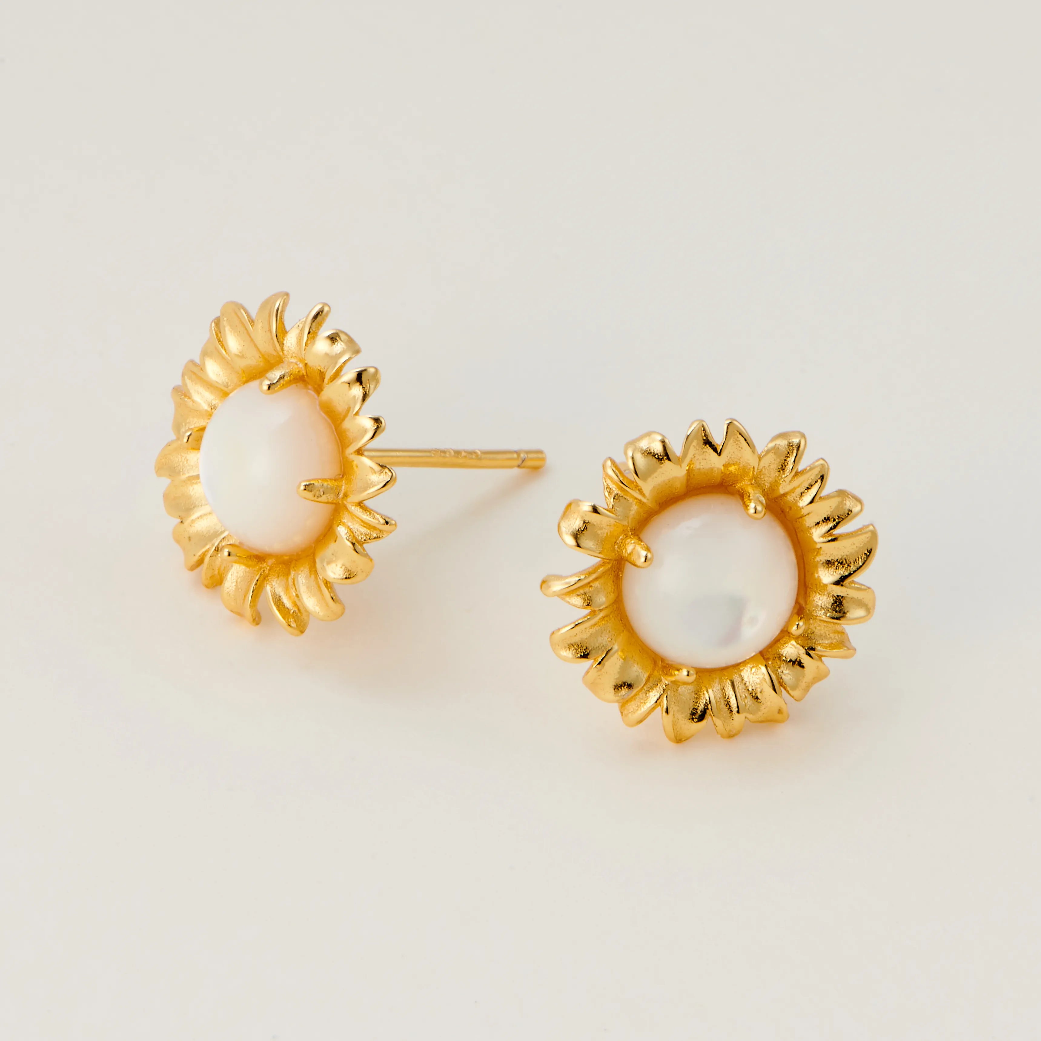 These gold-plated silver earrings depict an open sunflower with a white mother-of-pearl in the center, like a dazzling sun, around which a bursting solar corona opens like golden petals.