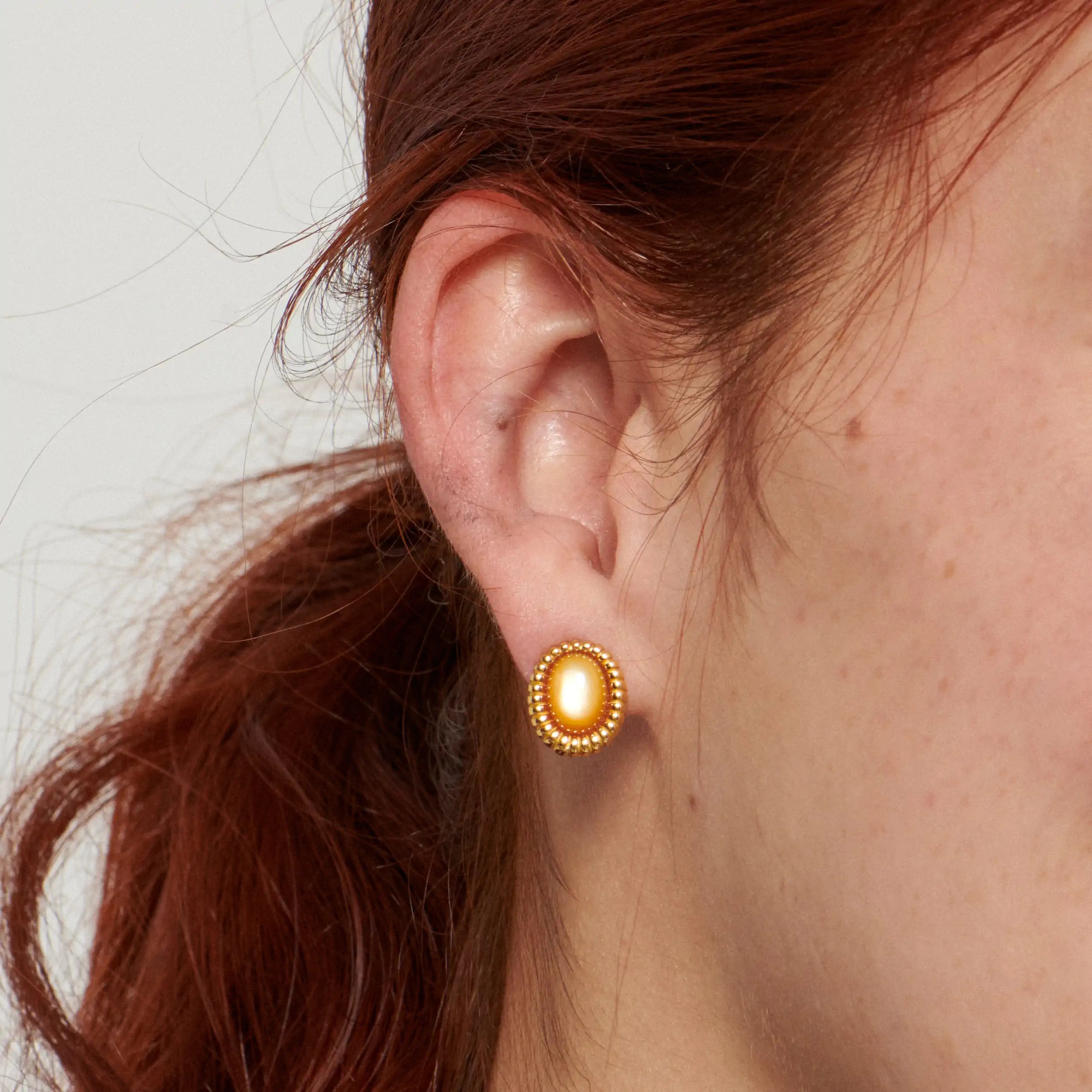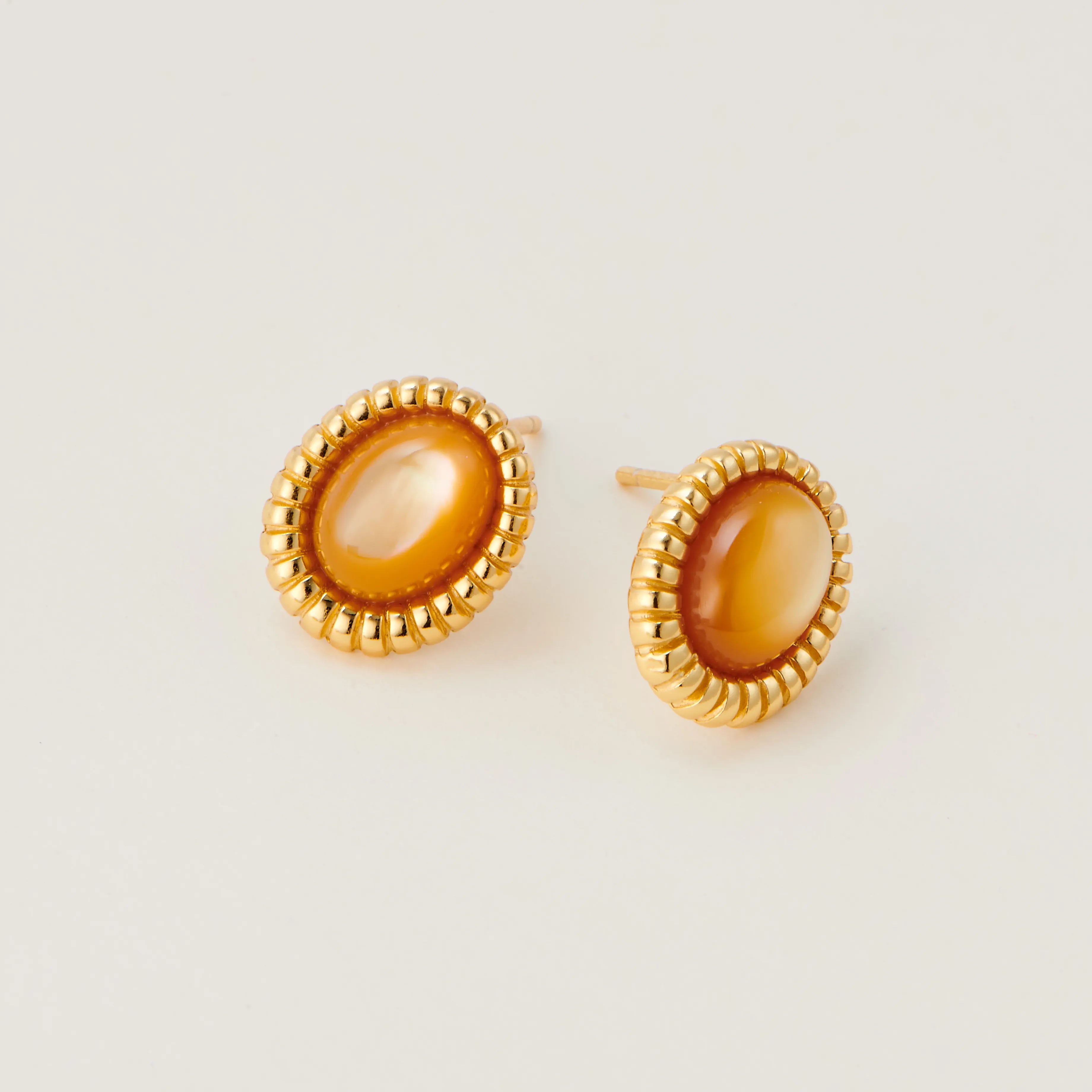 Honey Glow is a pair of earrings made of sterling silver, polished gold-plated, with an oval nacre in the center, which shines in a golden yellow color and, when rotated in the light, creates the appearance of a sweet drop of honey.