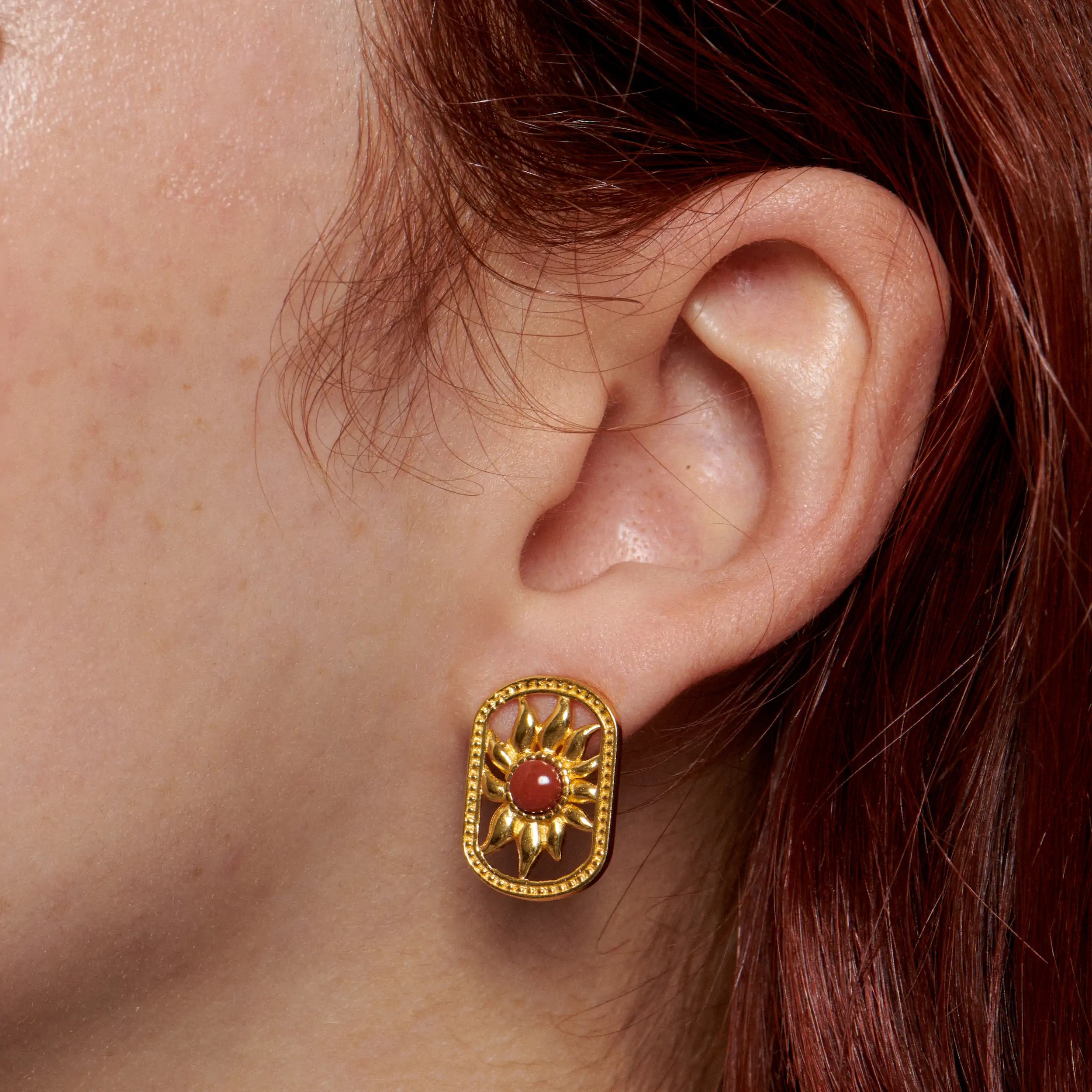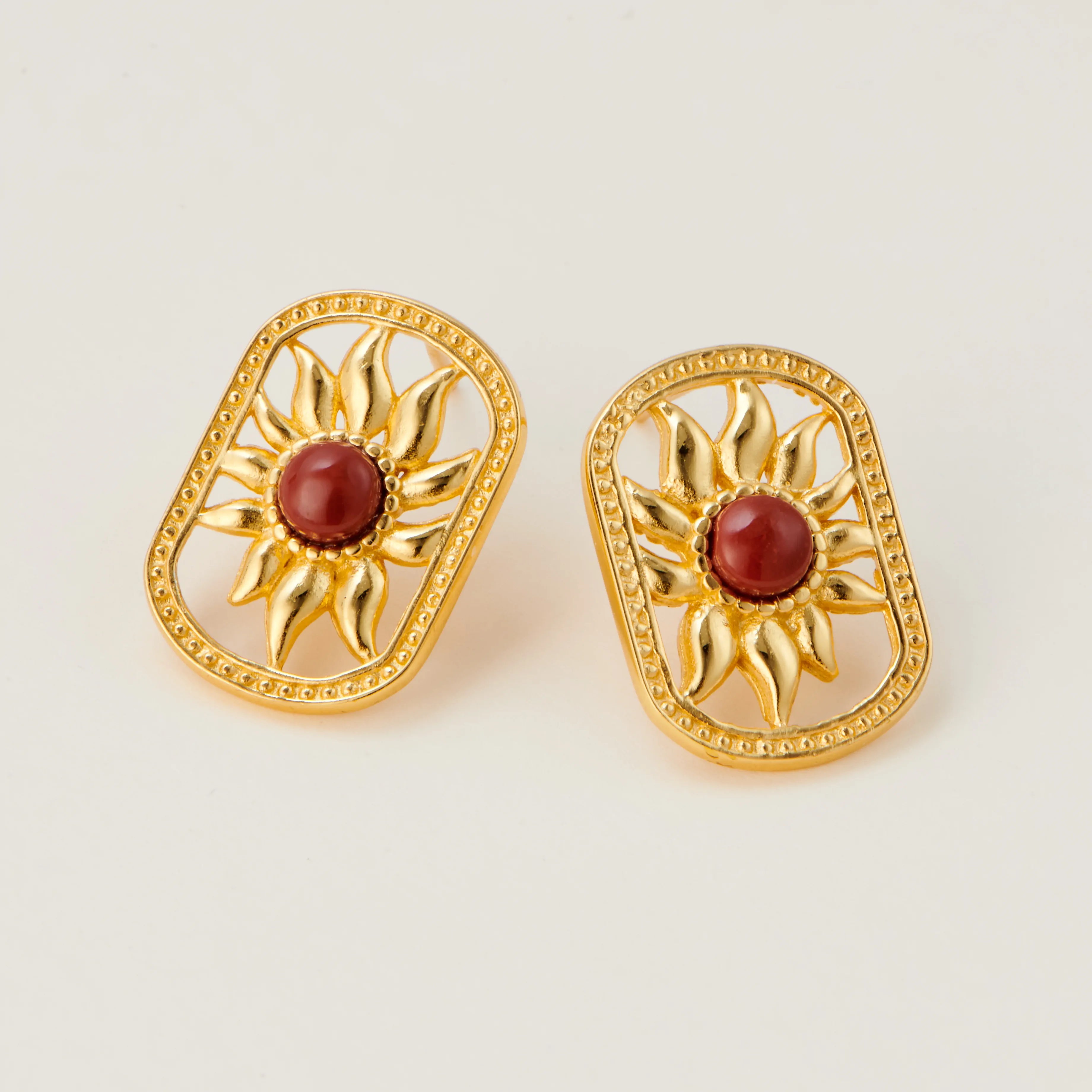 A fiery red agate sun is the centerpiece of this pair of earrings, surrounded by golden sunbeams in a pearl-structured frame.