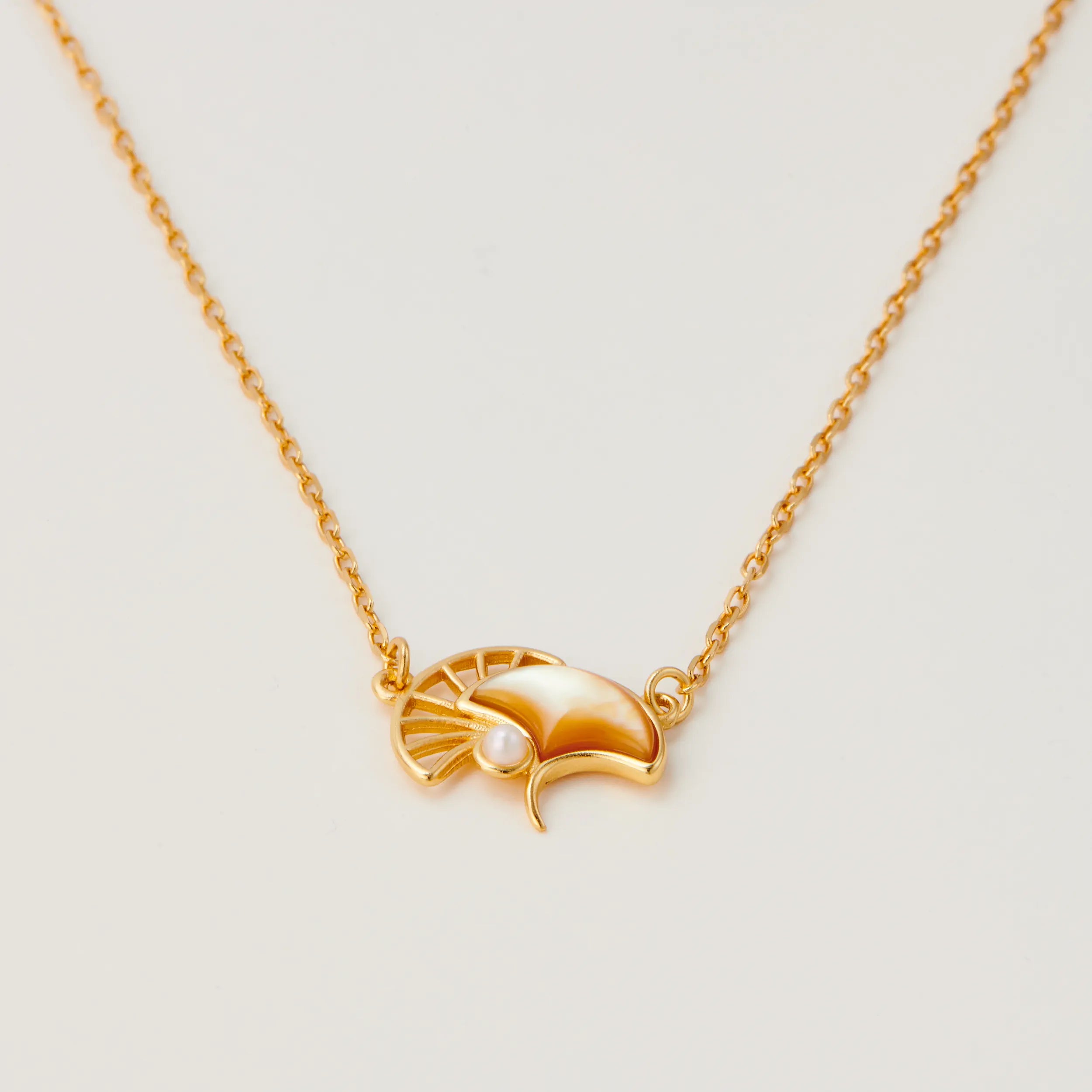 The pendant on this gold-plated silver necklace features an open shell patterned with a pleasant golden-yellow nacre. Next to it lies its treasure, a freshwater pearl.