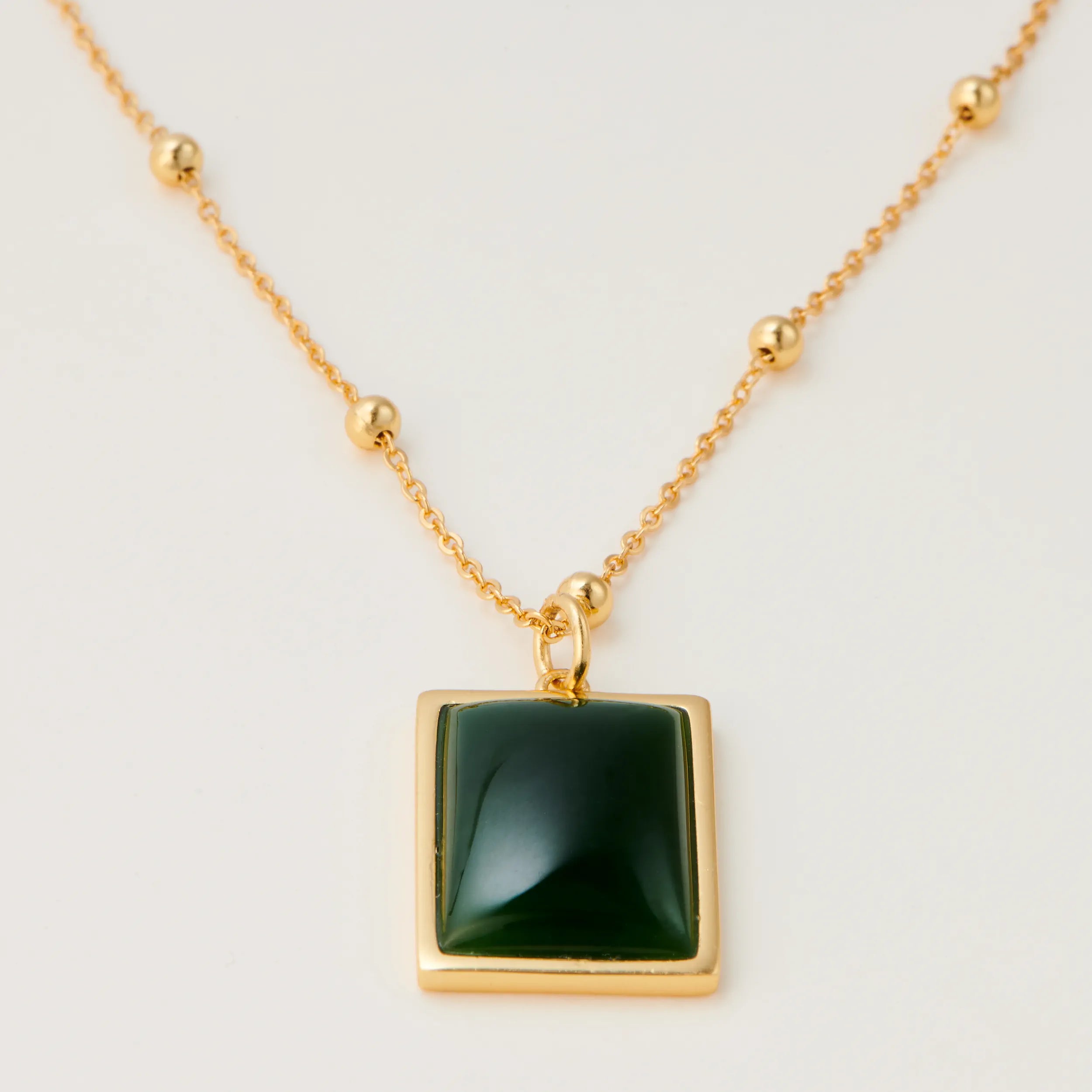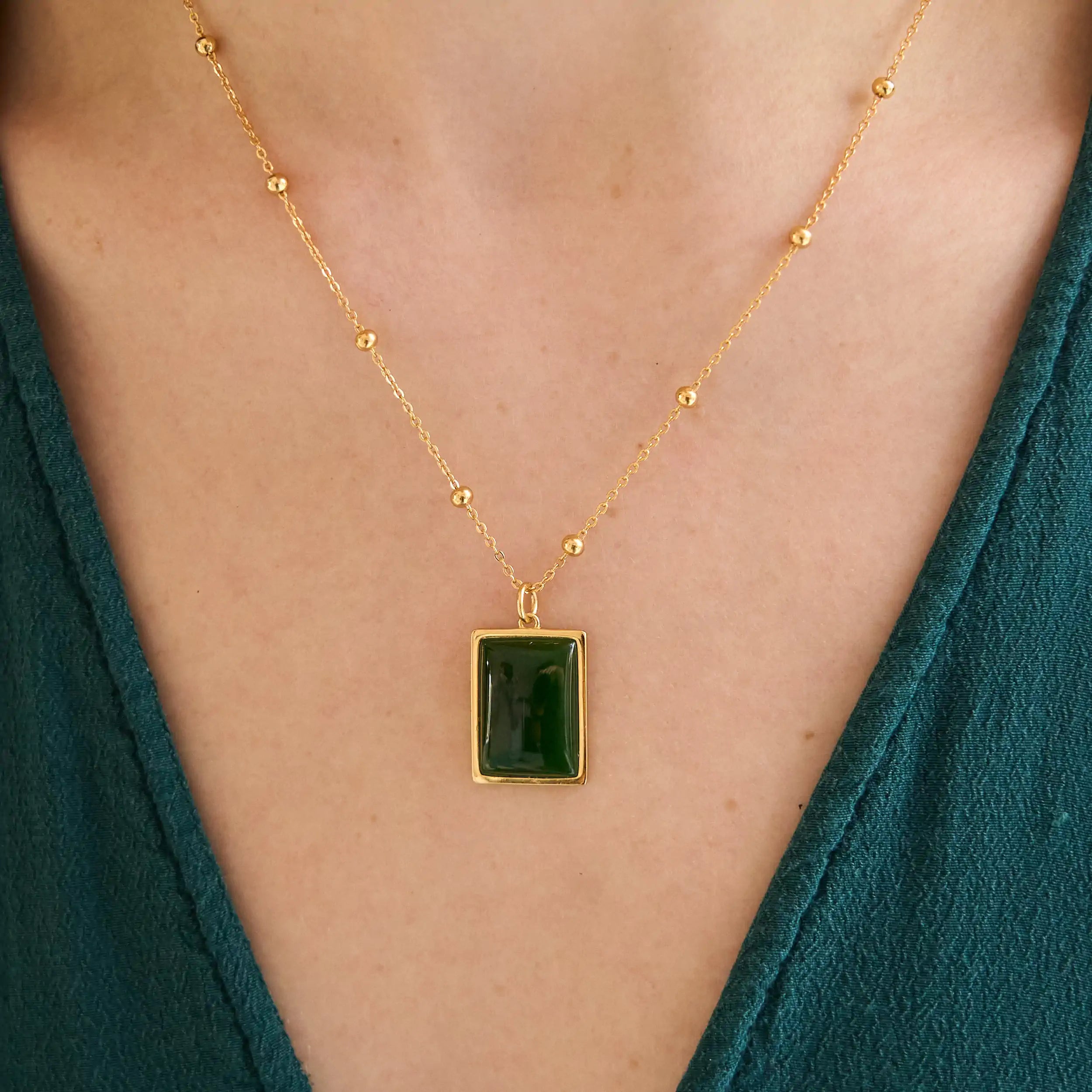 This elegant necklace with deep green jasper in its gold-plated silver setting is like a forest enclosed in jewelry, and the pendant is a window through which nature opens up to us.