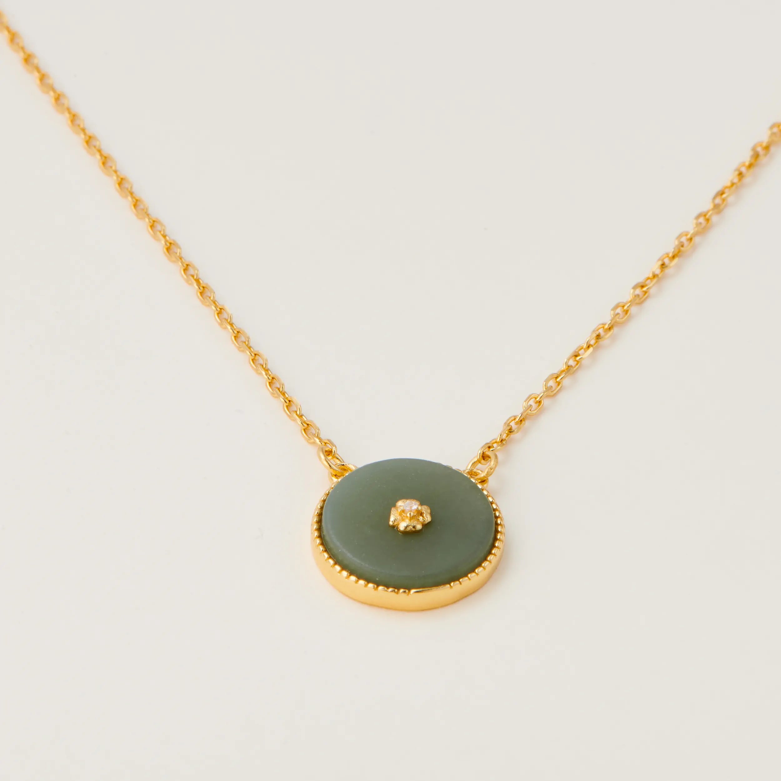 This pleasant, natural green nephrite stone in a gold-plated silver setting evokes a small garden, with a small flower or fountain in the middle.