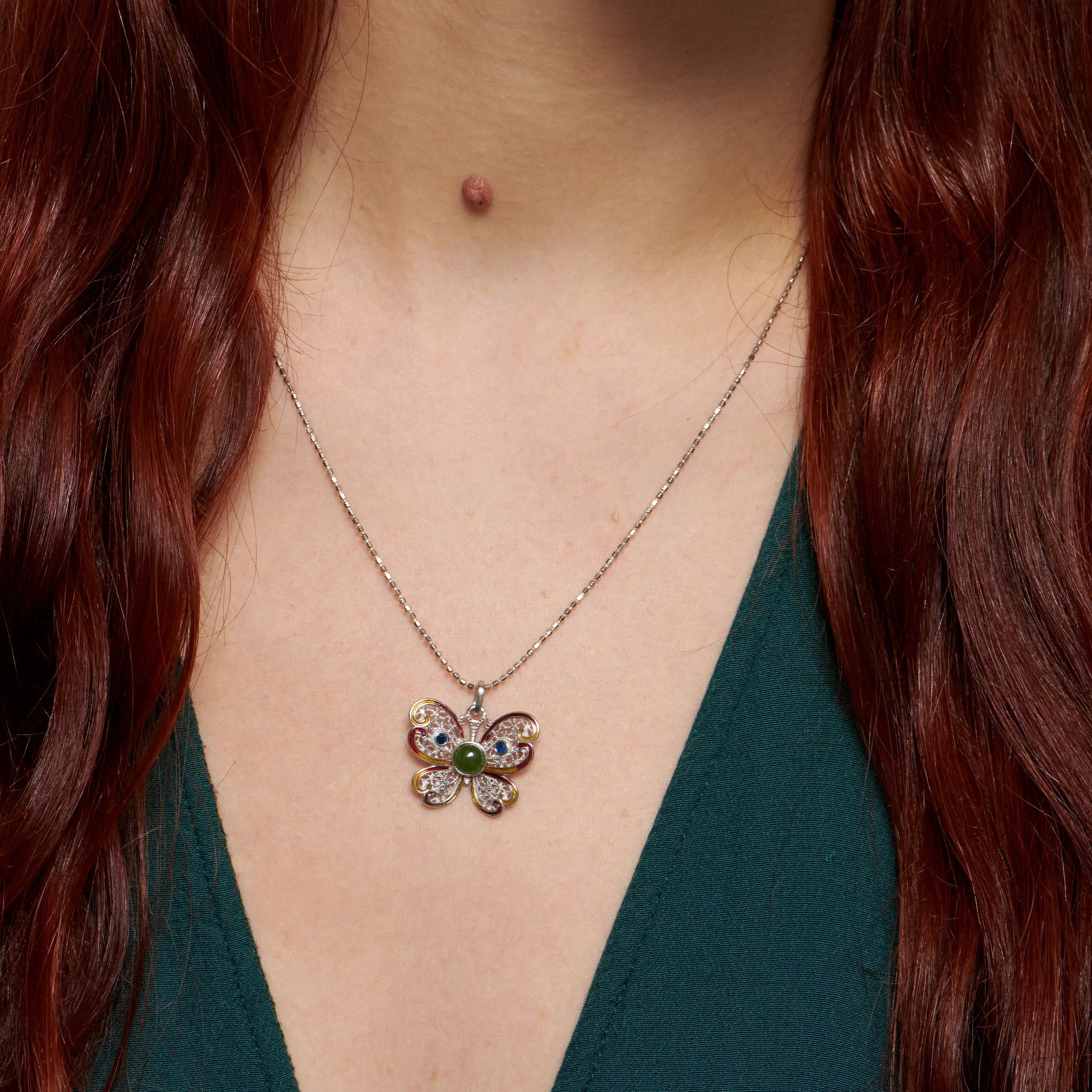 This pendant exudes playful elegance and nature-inspired beauty with its intricate butterfly design. Crafted from sterling silver, it features a green jasper stone at the center, surrounded by delicate filigree work and vibrant embellishments. The combination of silver and green creates a fresh and vibrant look. ( Price is for the pendant only, necklace not included. )