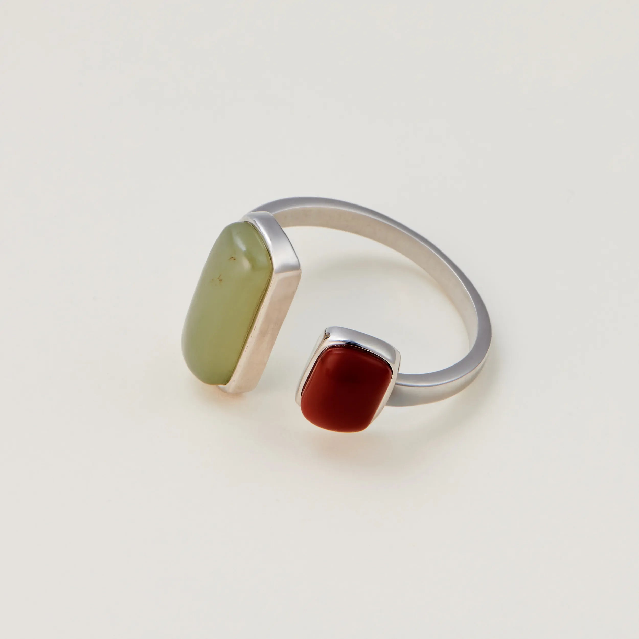 A silver ring with modern lines, the larger, soft green jade stone is complemented by a smaller, vibrant red agate, in a modern, asymmetrical design.