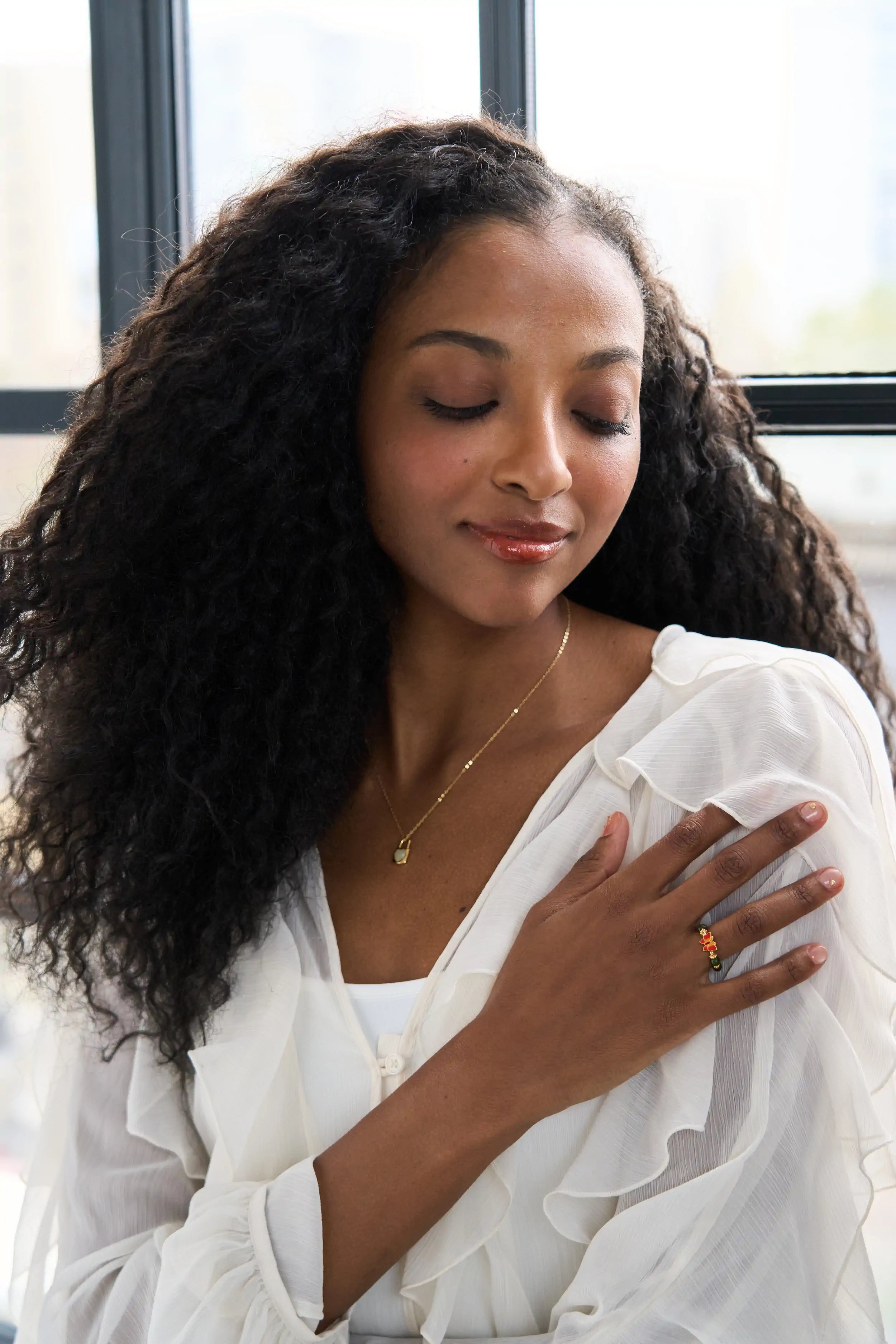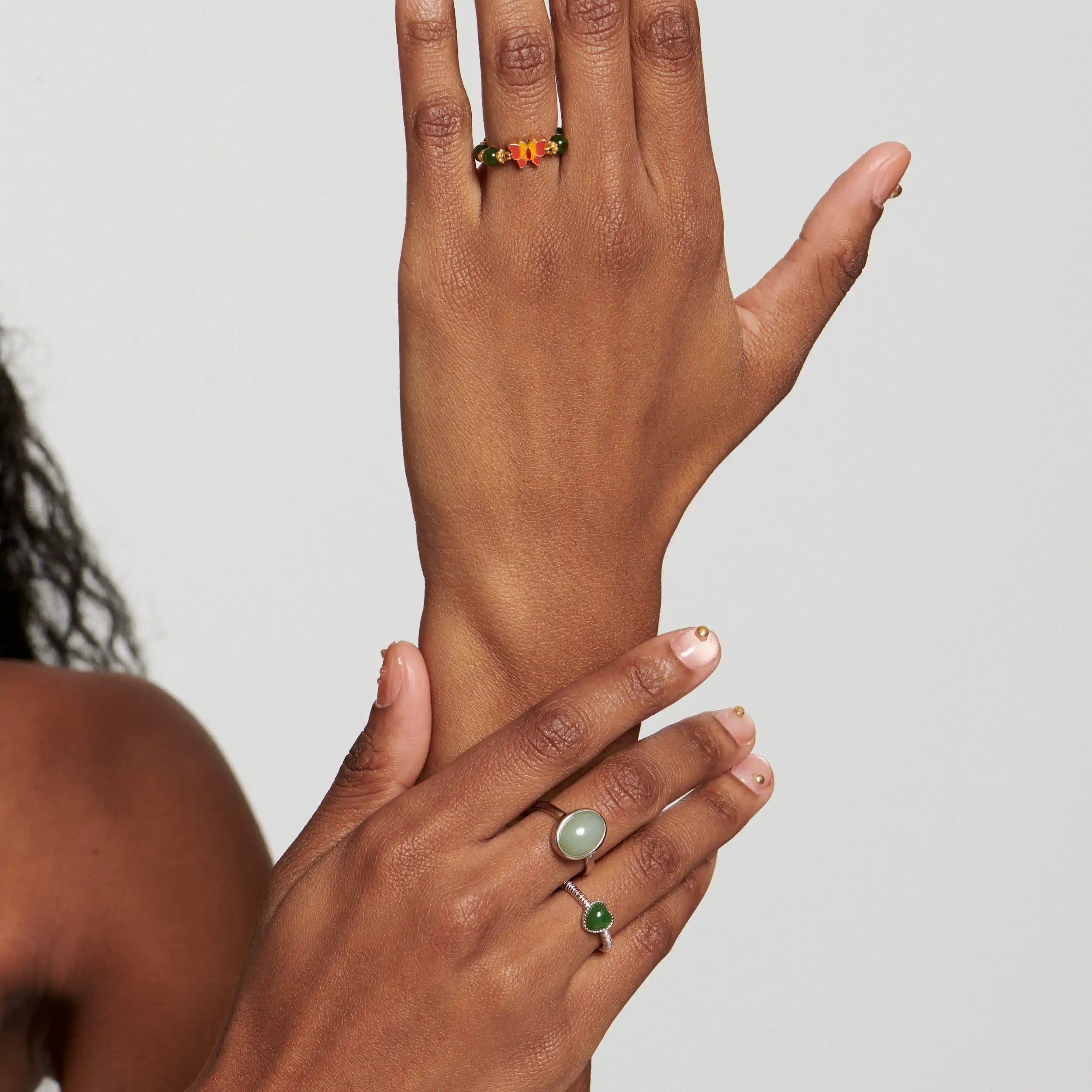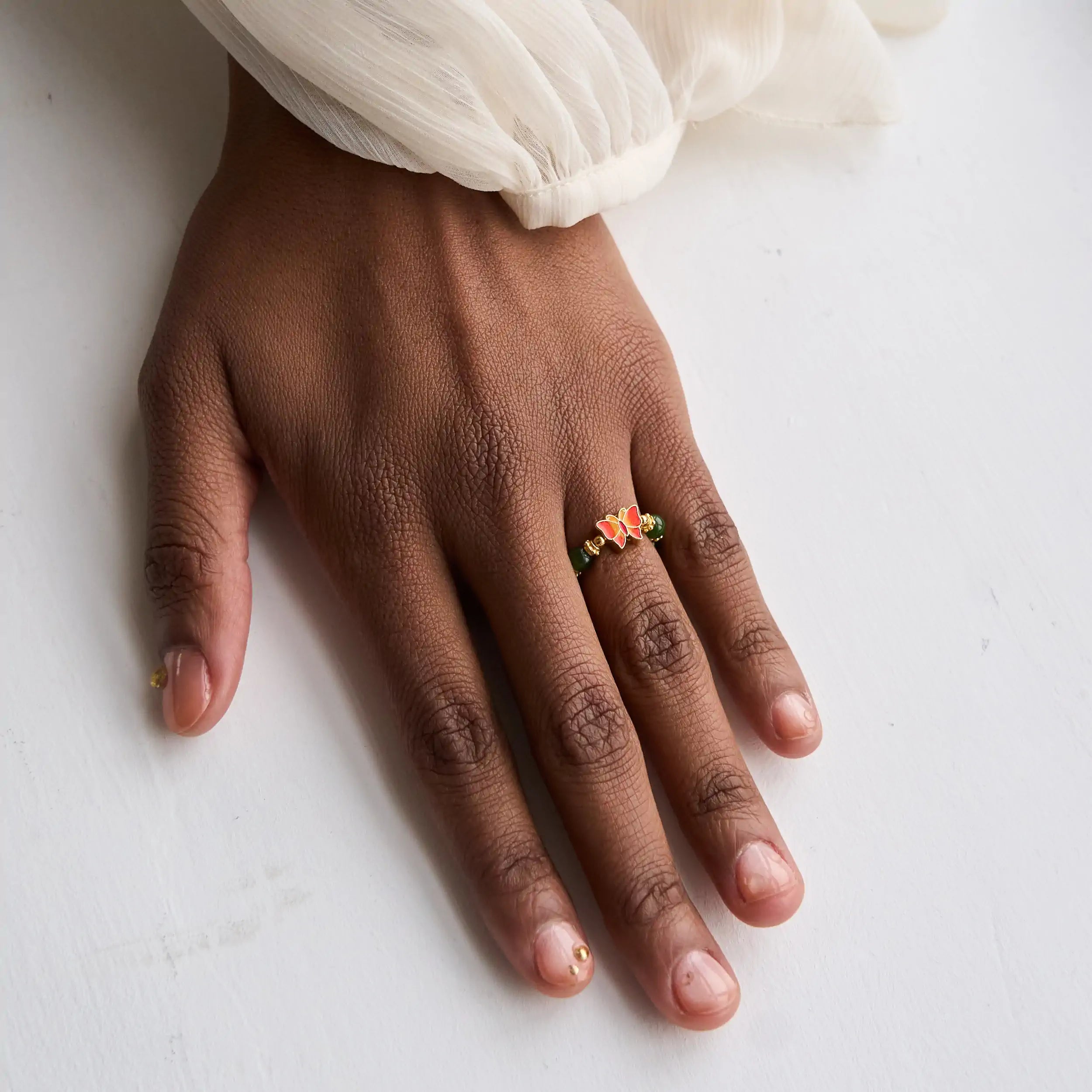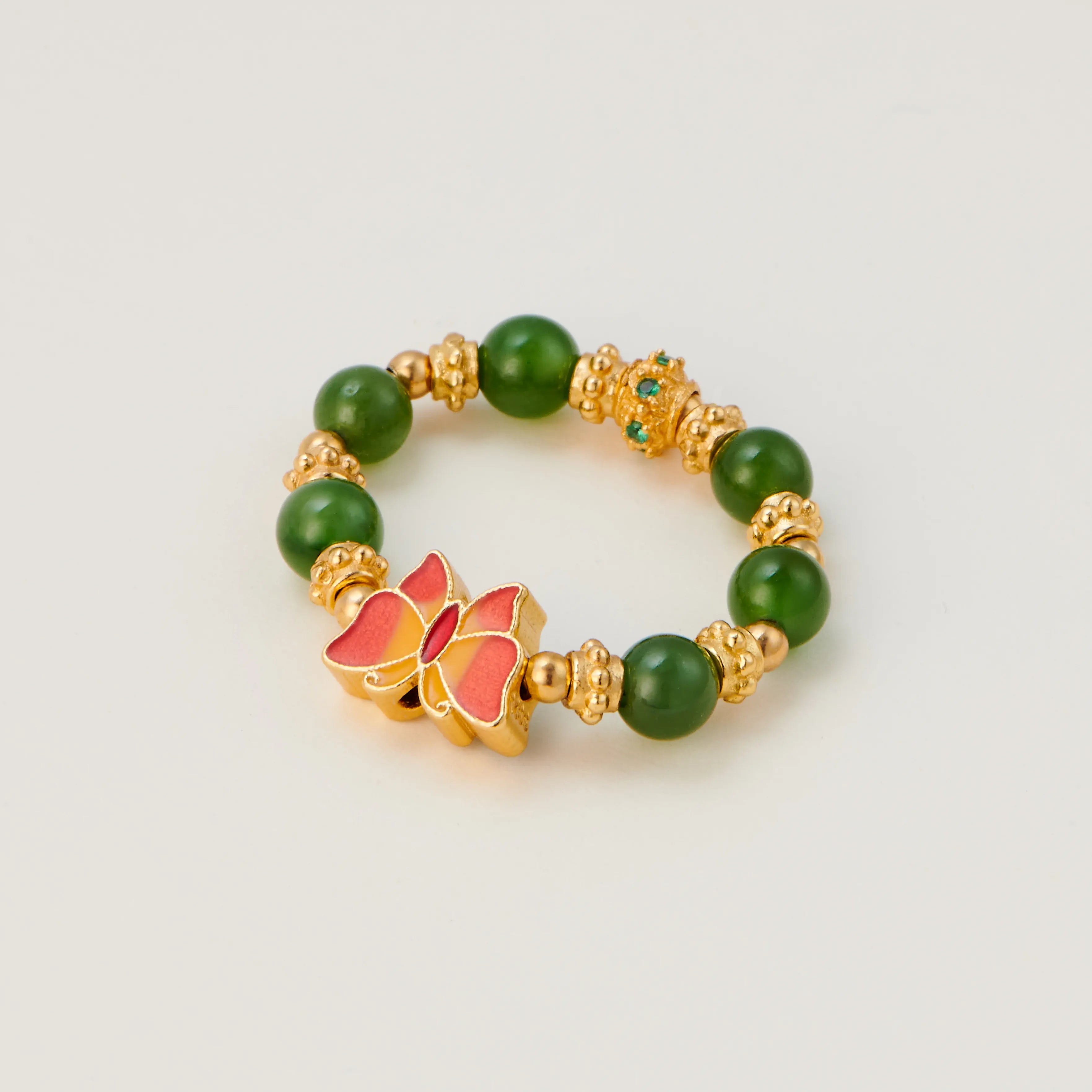 A flexible and relaxed ring with green jasper beads and a colorful butterfly in the center, with gold-plated sterling silver between the stones. An airy and comfortable ring with natural colors.