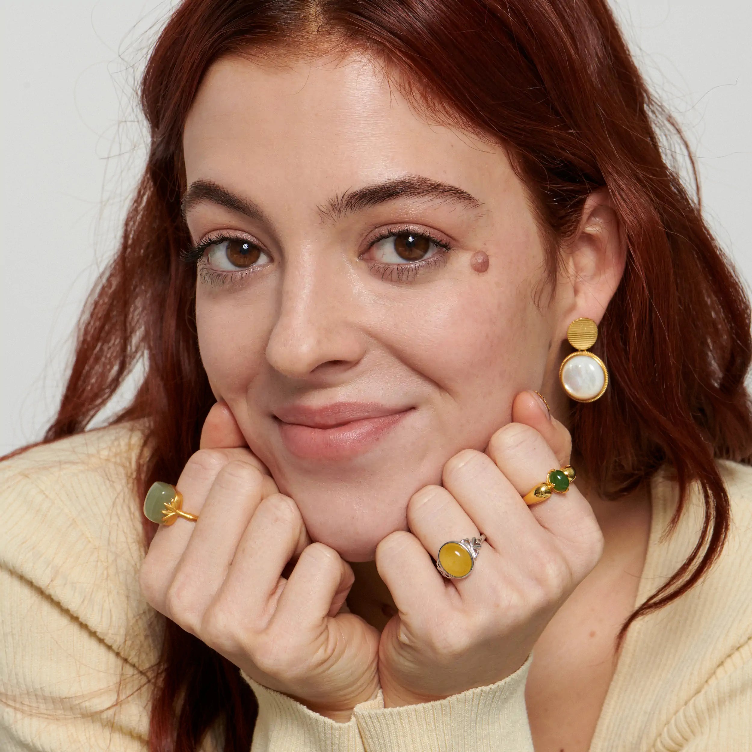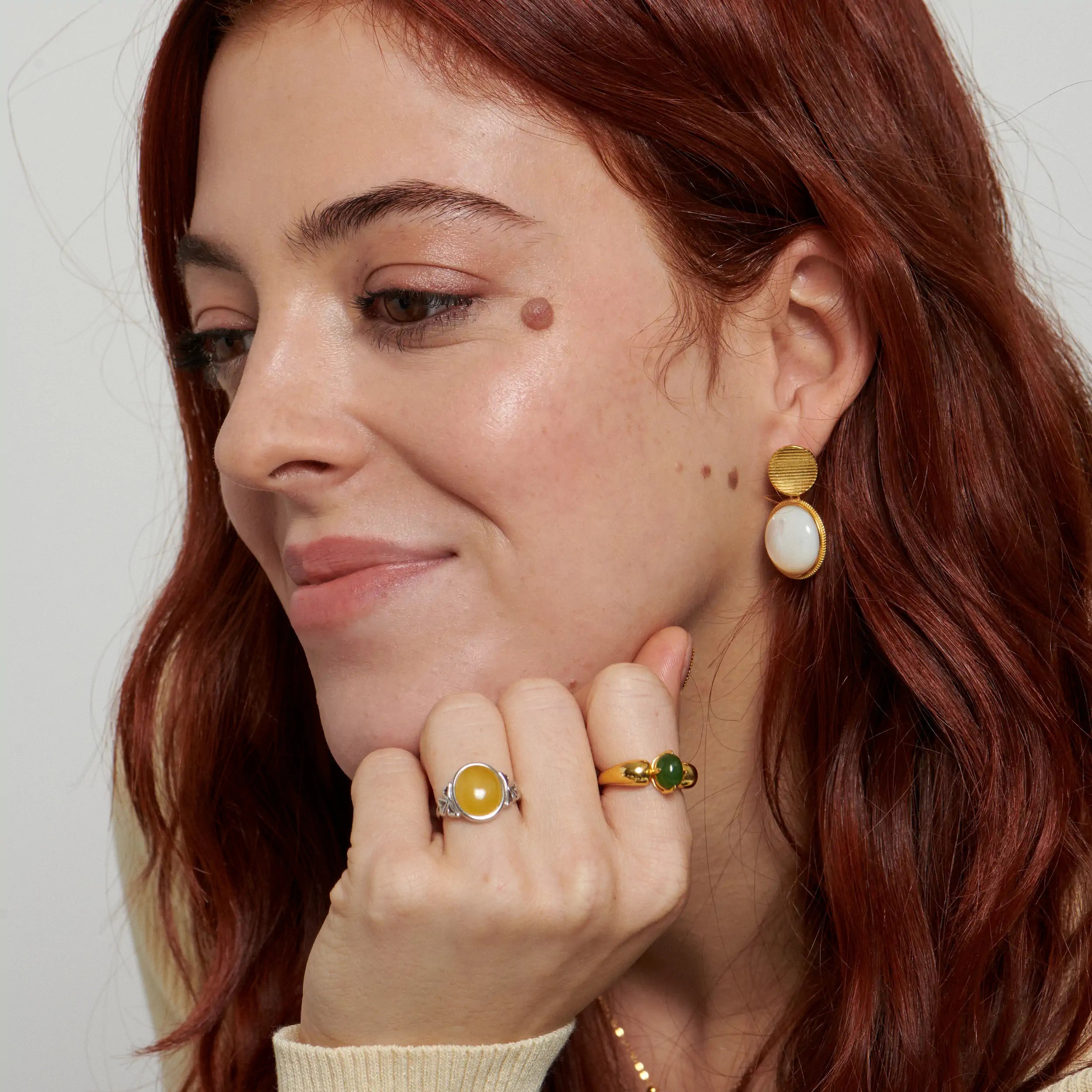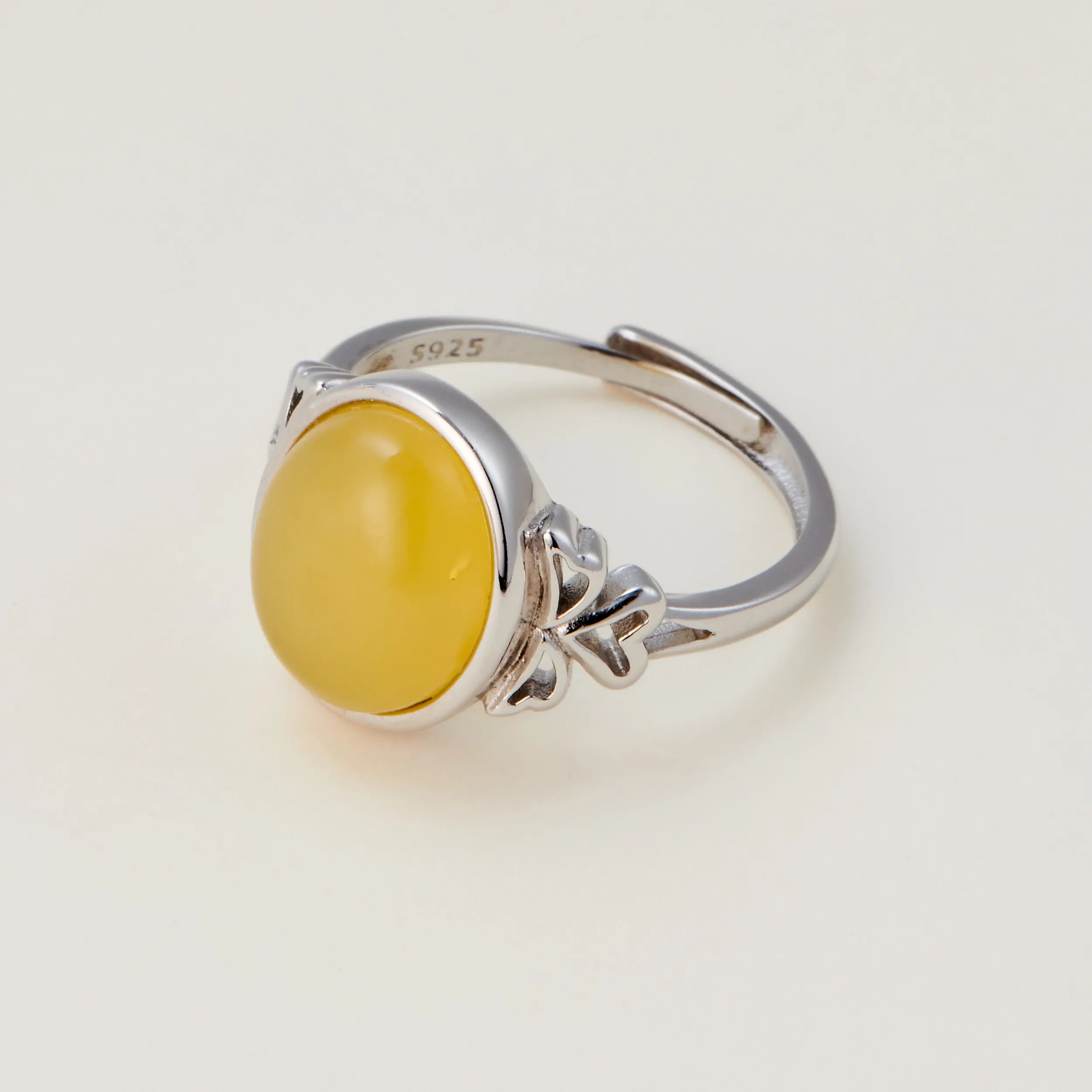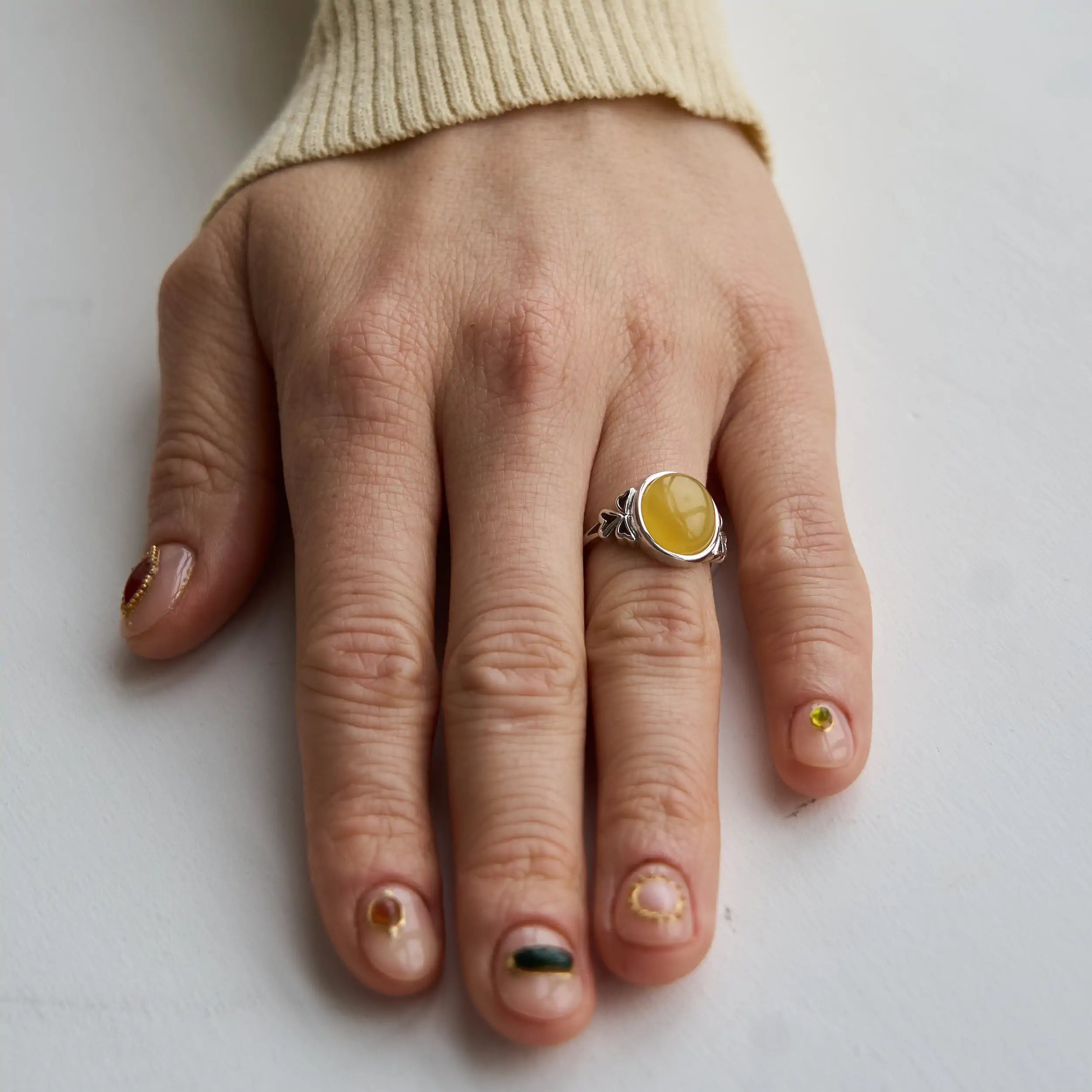 A radiant honey-colored stone sits at the center of this elegant ring, its smooth, convex surface catching the light like liquid amber. A slim, curved band maintains the ring's sophisticated silhouette, balancing the bold center stone with the meticulous silverwork.