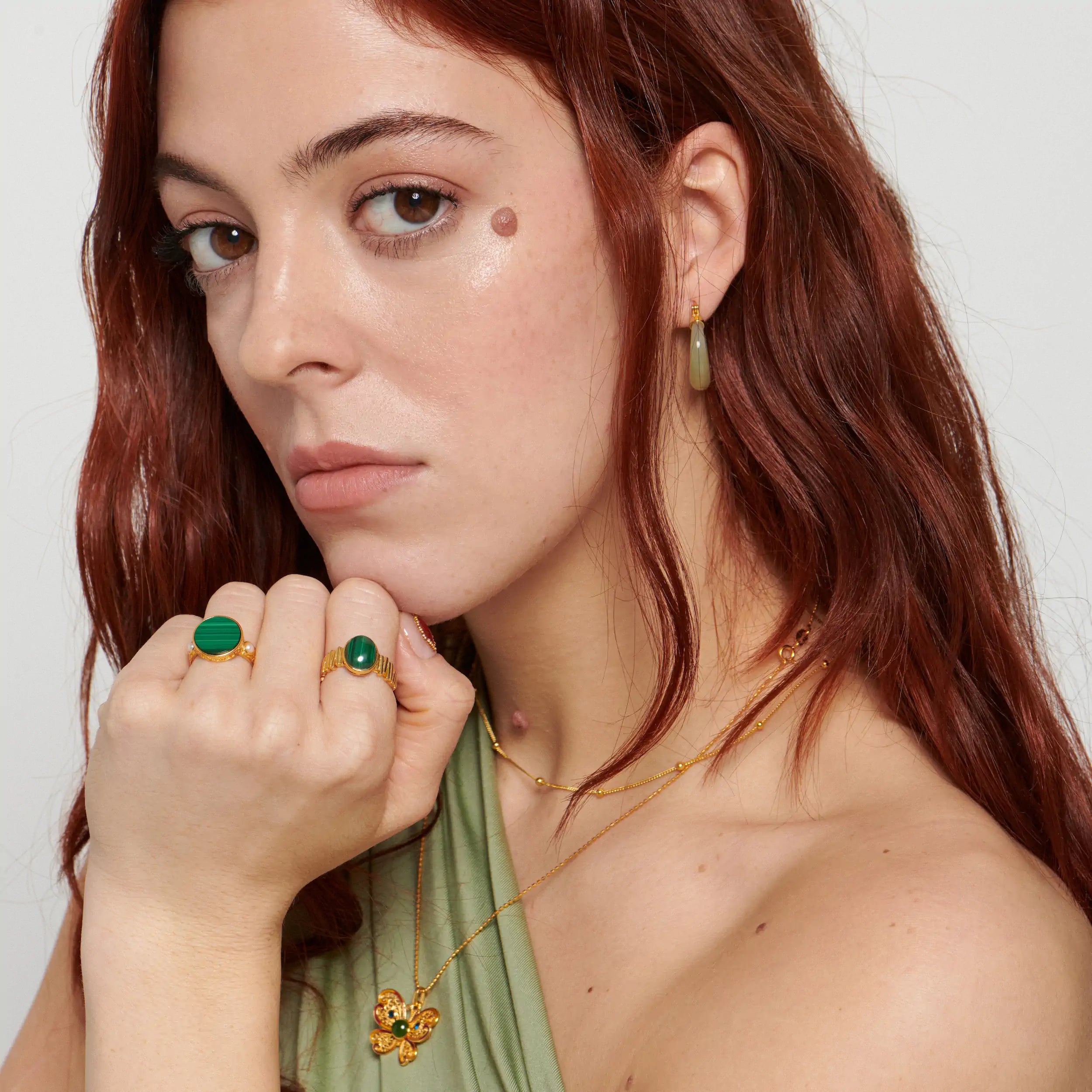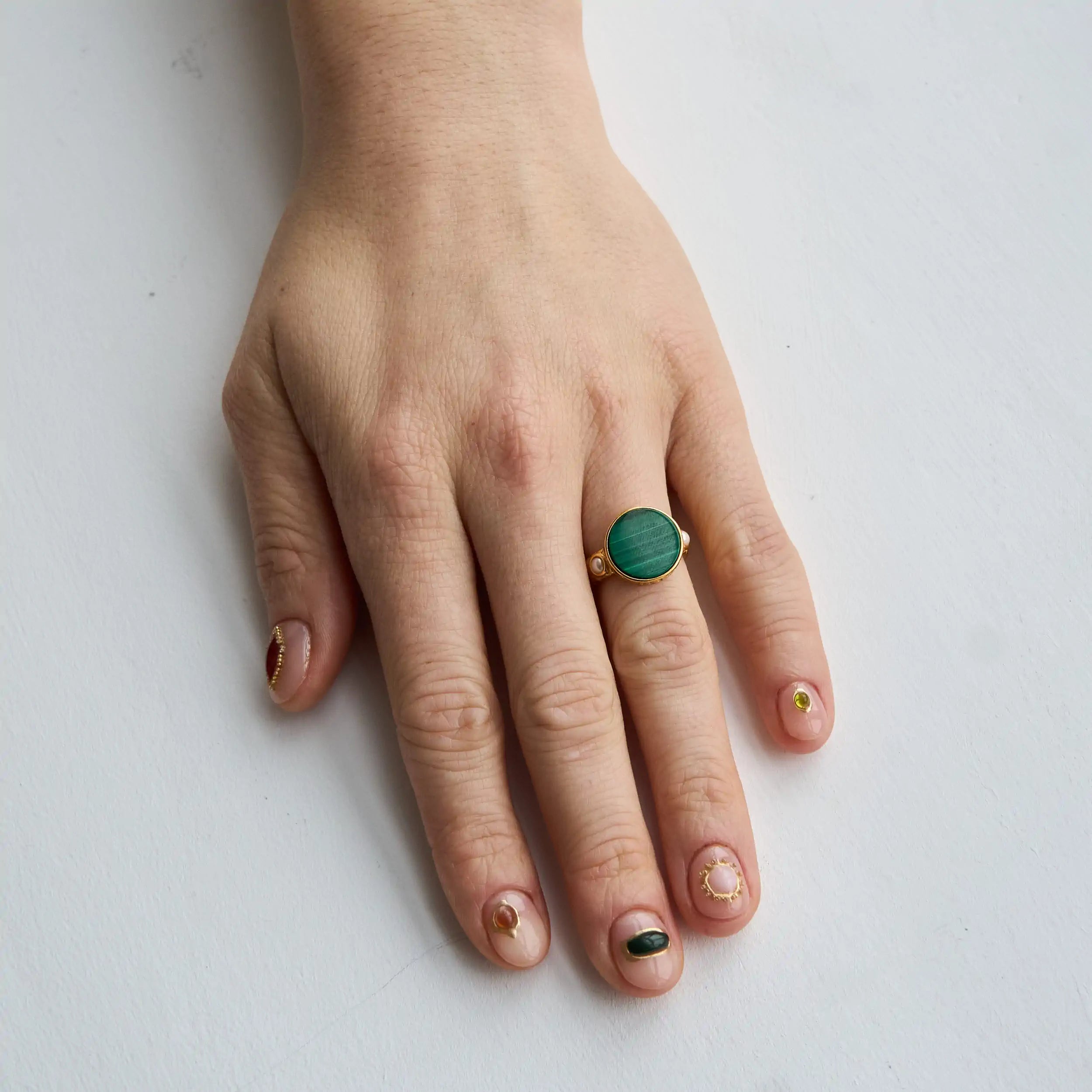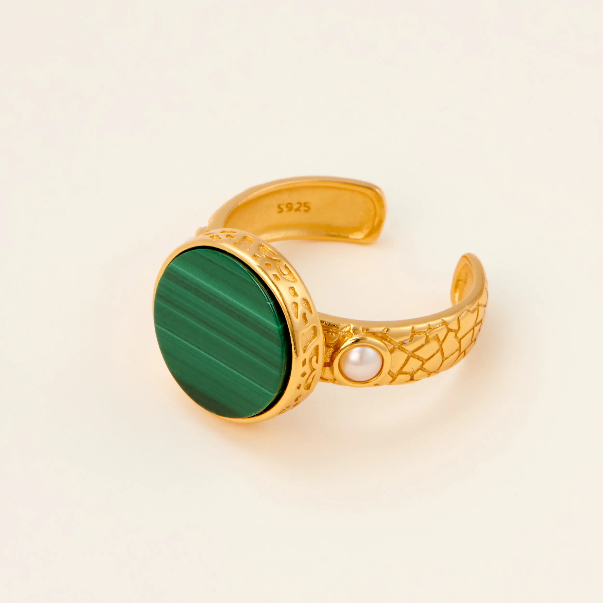 This modern, geometric ring is made of a combination of green and gold, with a distinctive malachite as the center stone. Its setting and band have a golden, desert-like structure, creating an overall look like a vibrant, green oasis in the middle of the desert.