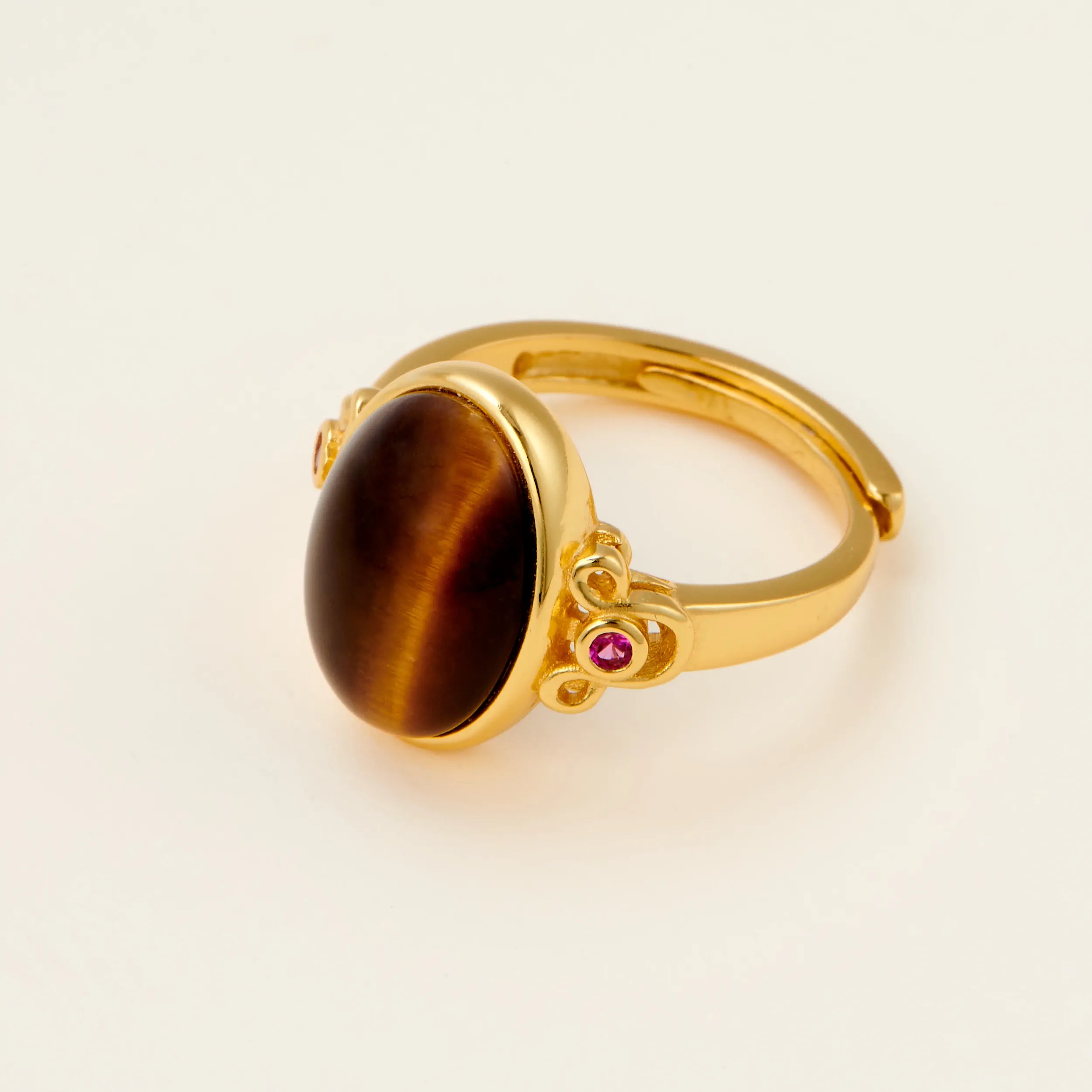 Gold-plated silver ring with a burgundy tiger's eye stone in the center of the ring, small pink stones on both sides, and classic decorative elements on the setting.