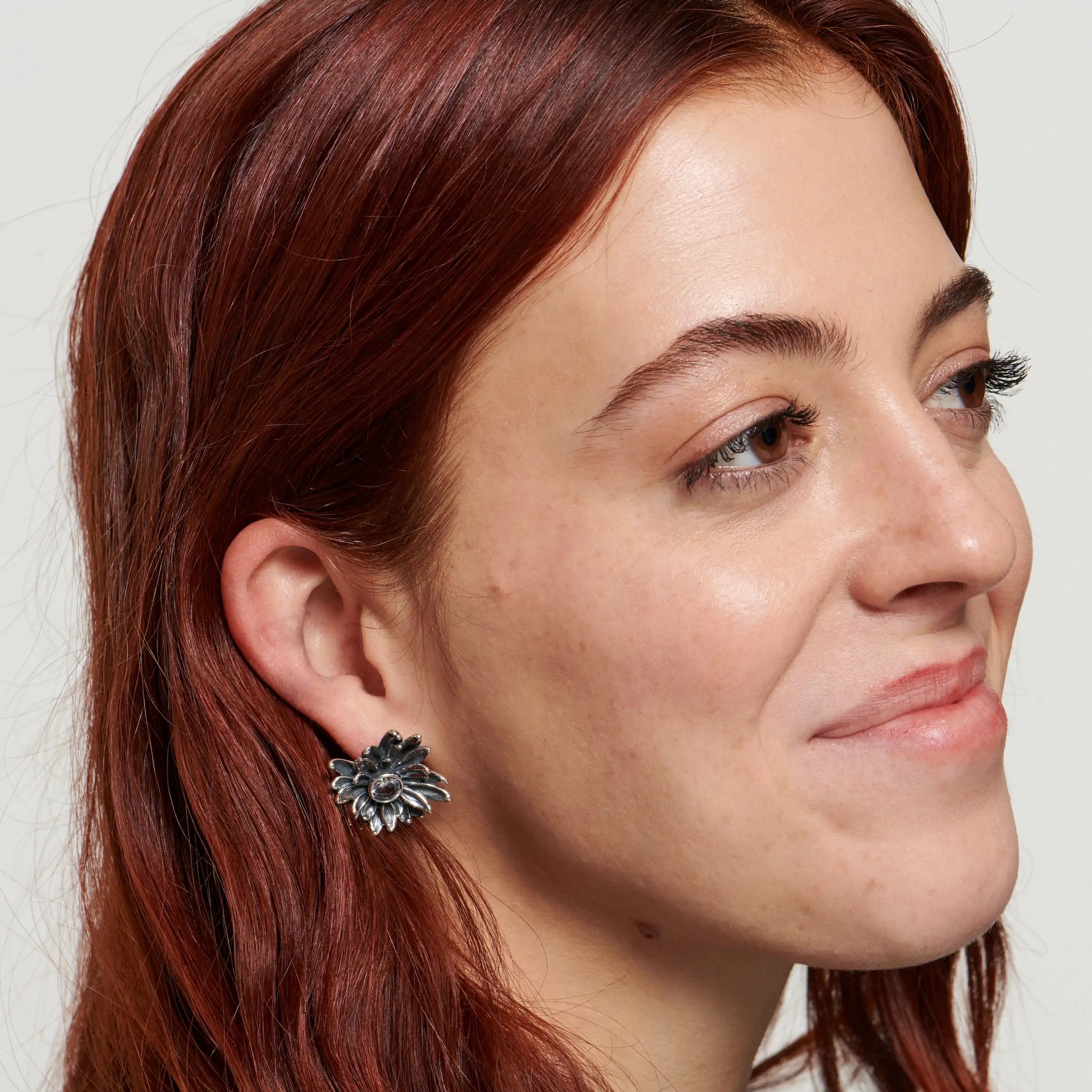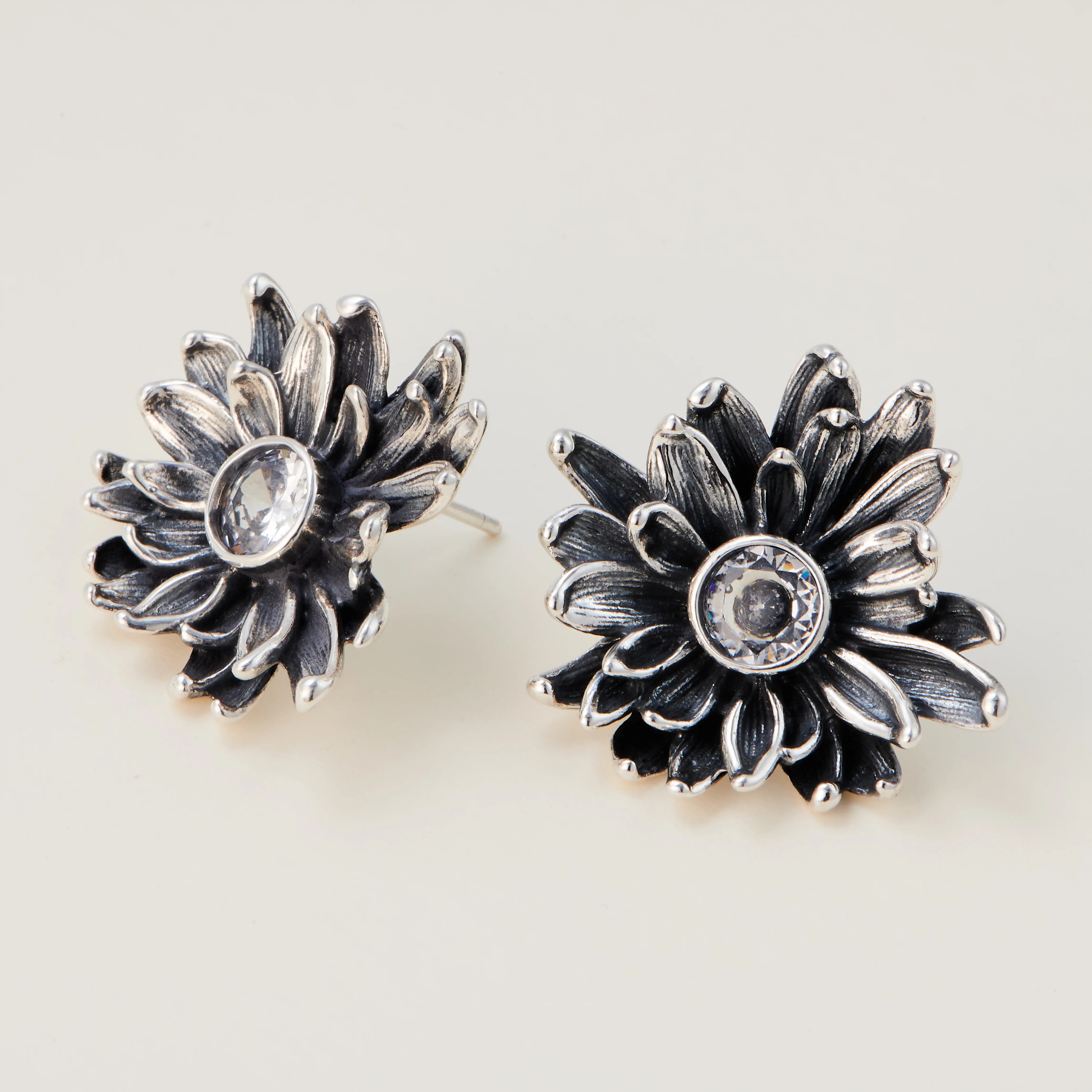 This inviting flower, rich in petals and with a sparkling crystal in the center, is a richly decorated pair of earrings. These silver artisan masterpieces paint different shades of gray on their petals with polished and matte surfaces.