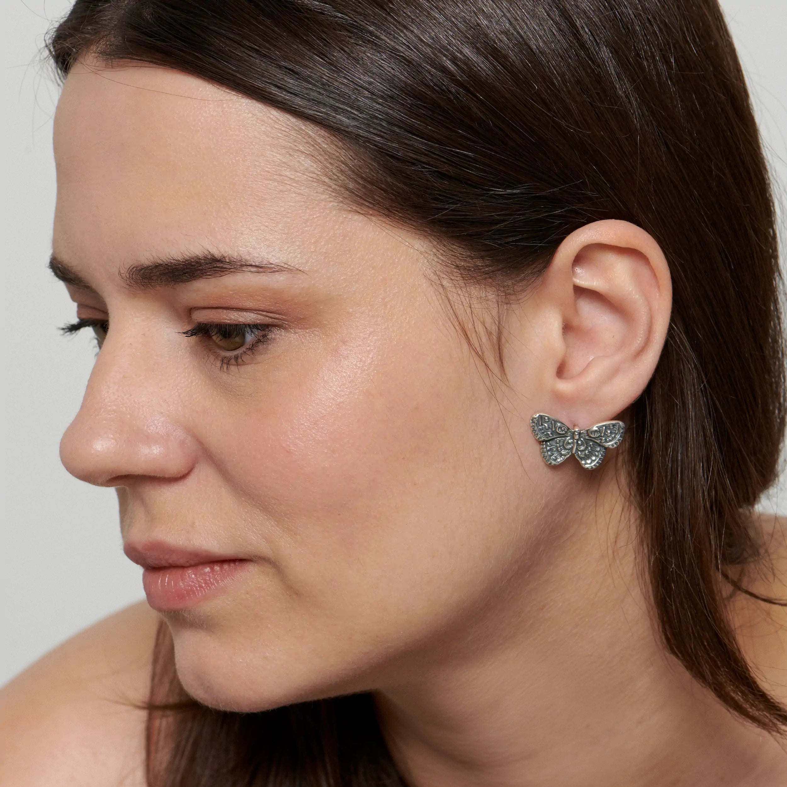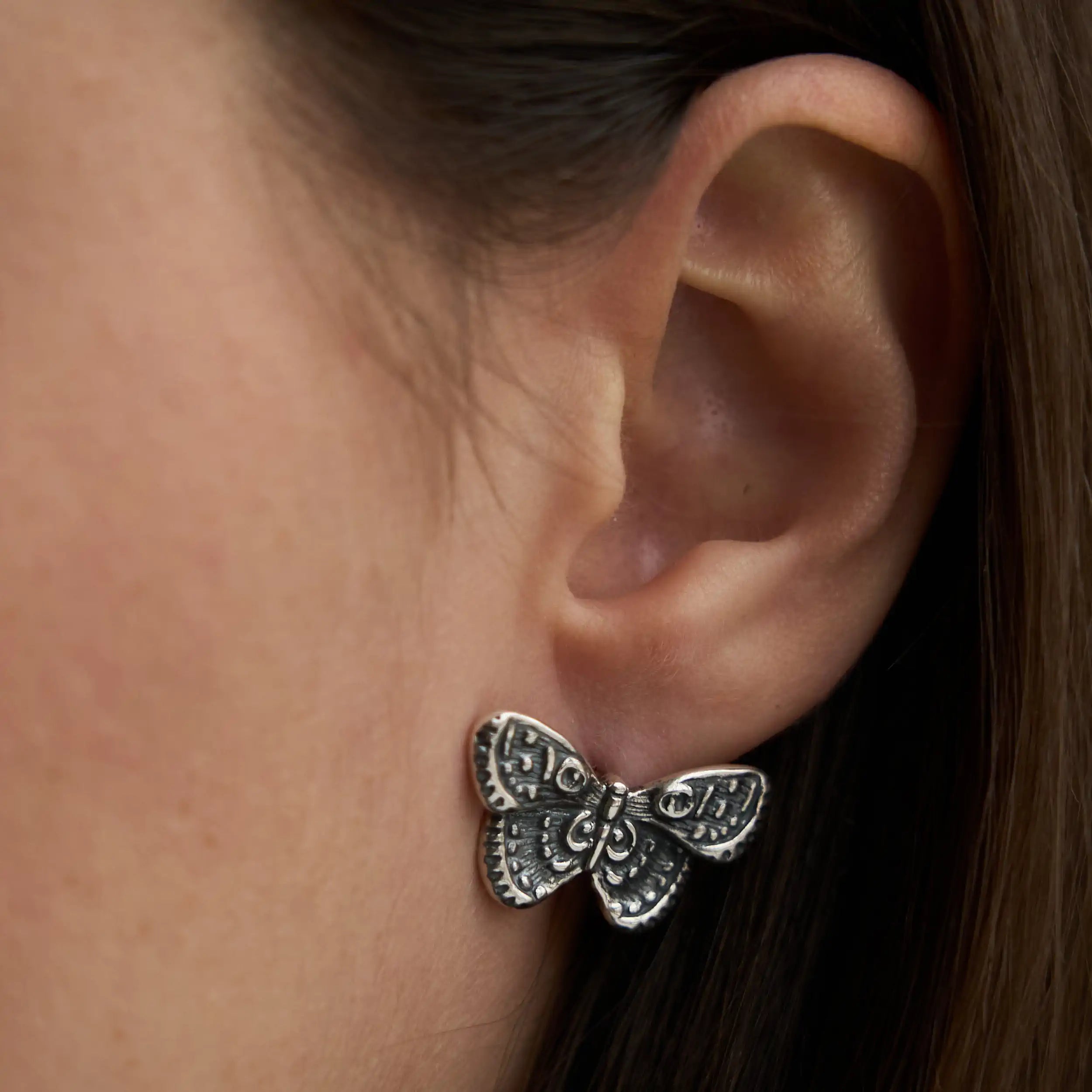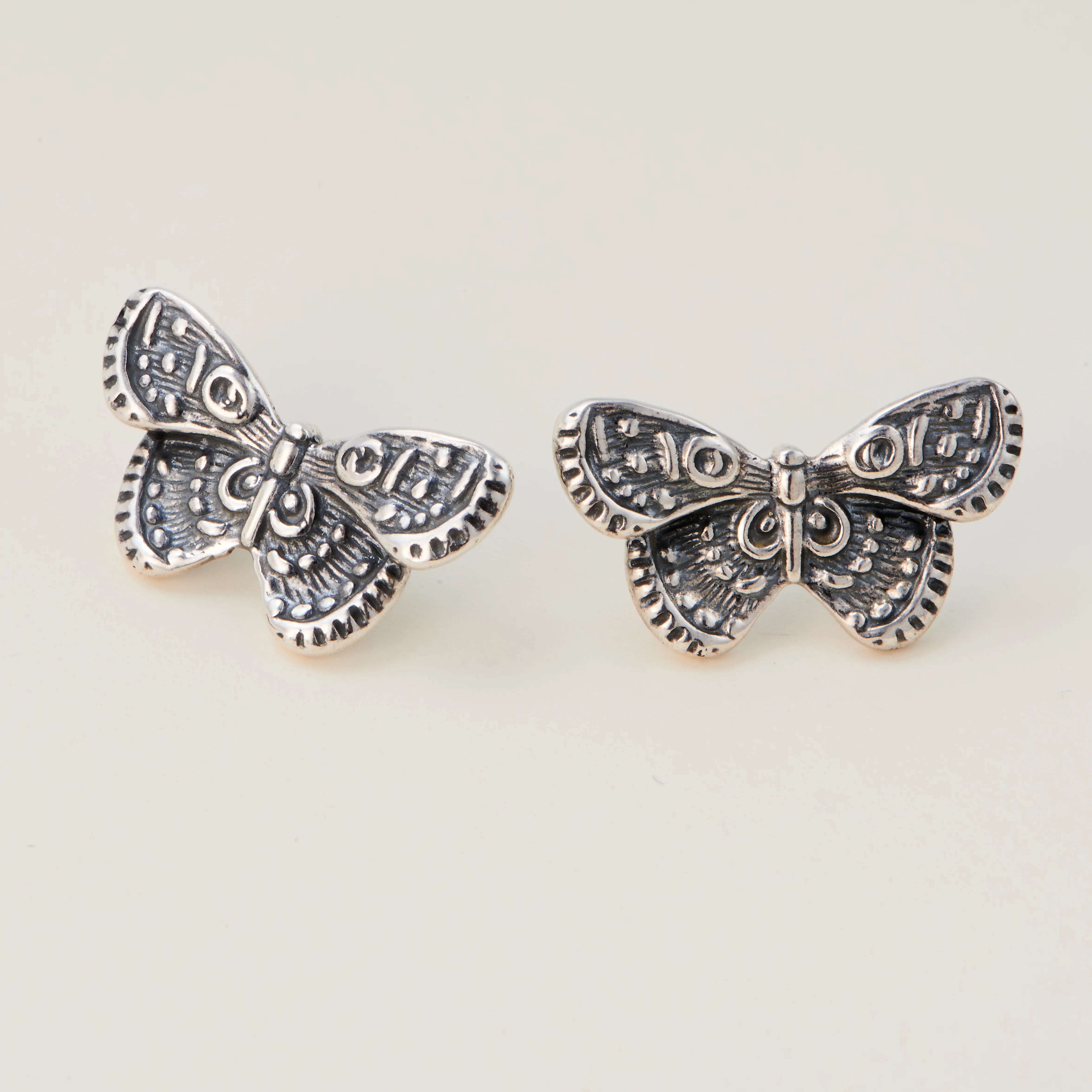 These nature-inspired earrings feature two exquisitely crafted butterflies, their wing patterns revealed by the contrast of deep, engraved lines and the reflective, high-polished surfaces.