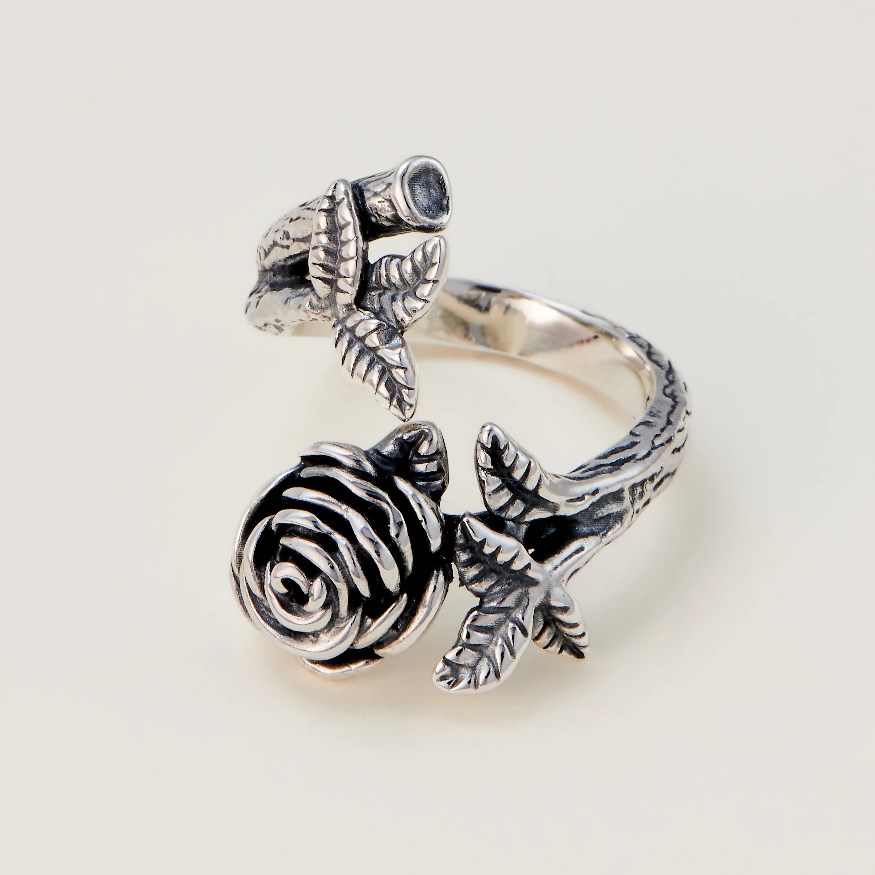 A blooming silver rose hugs the finger, and its unique, open design makes it comfortable to wear.