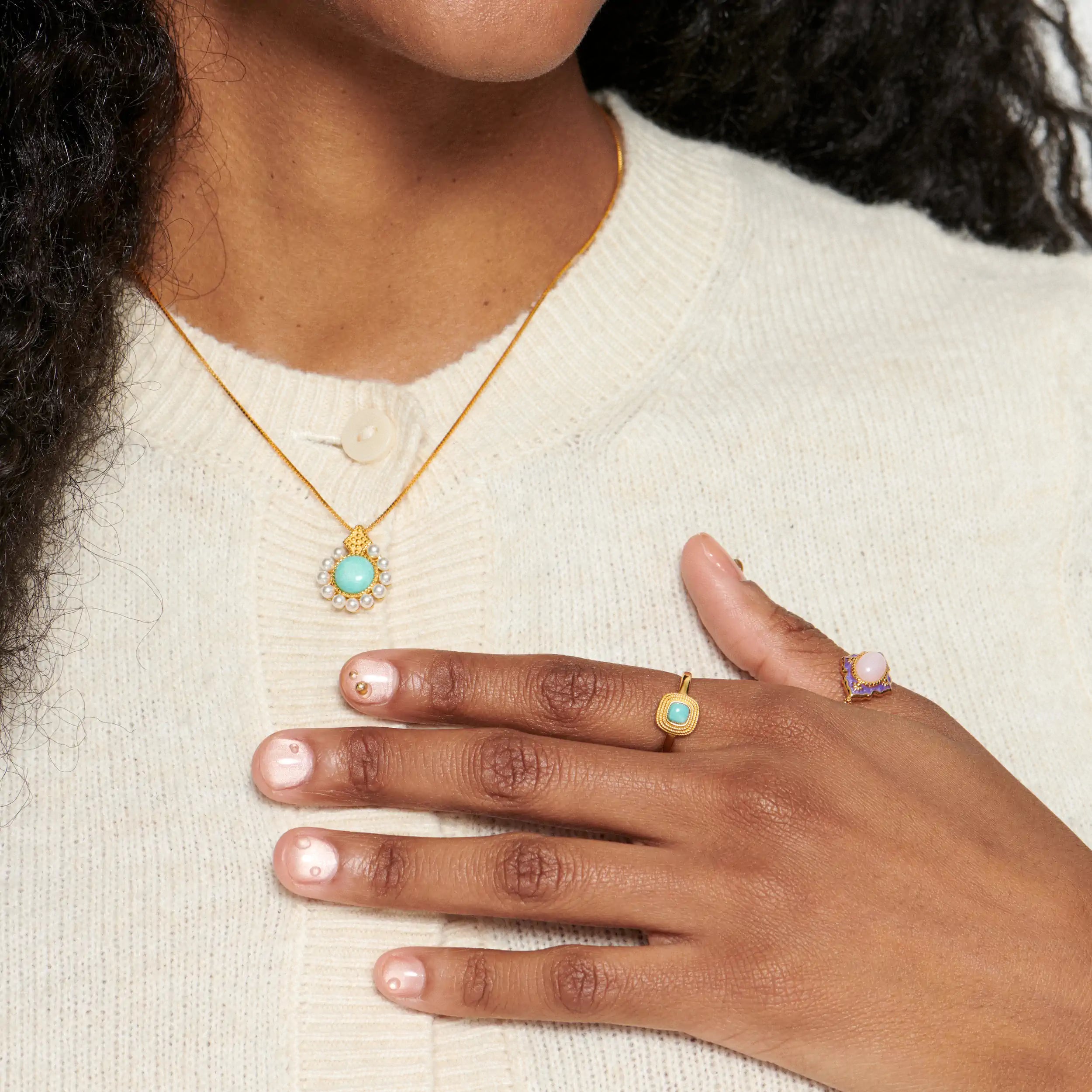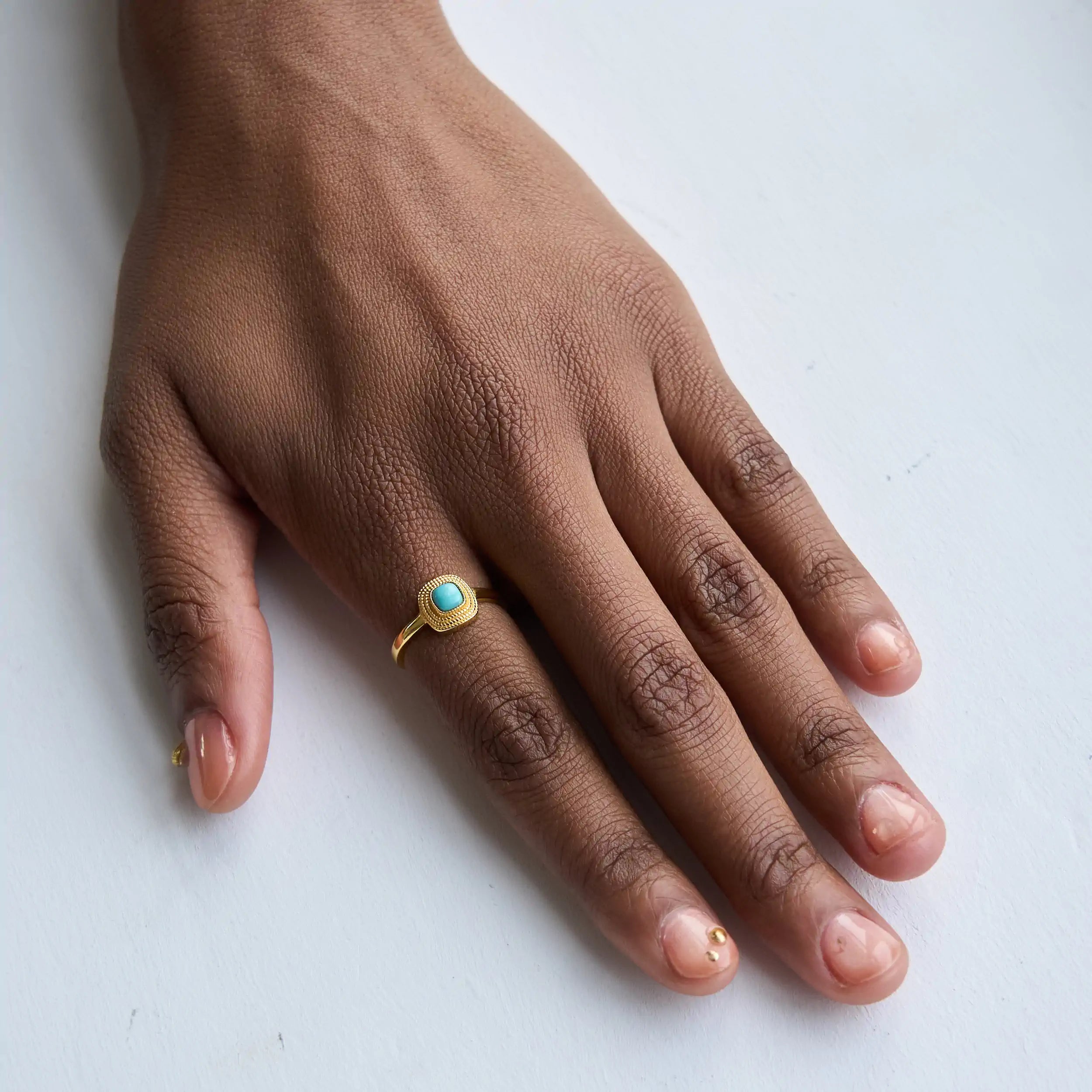 Turquoise has been a favorite gemstone for kings since ancient times. Its light blue color is reminiscent of a transparent, crystal-clear sea, symbolizing peace and tranquility. On the Golden Oasis ring, turquoise sits like an oasis in its gold setting, which with its pearly structured surface resembles a desert full of golden sand.
